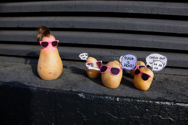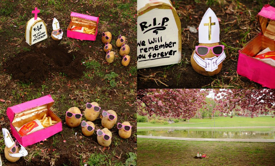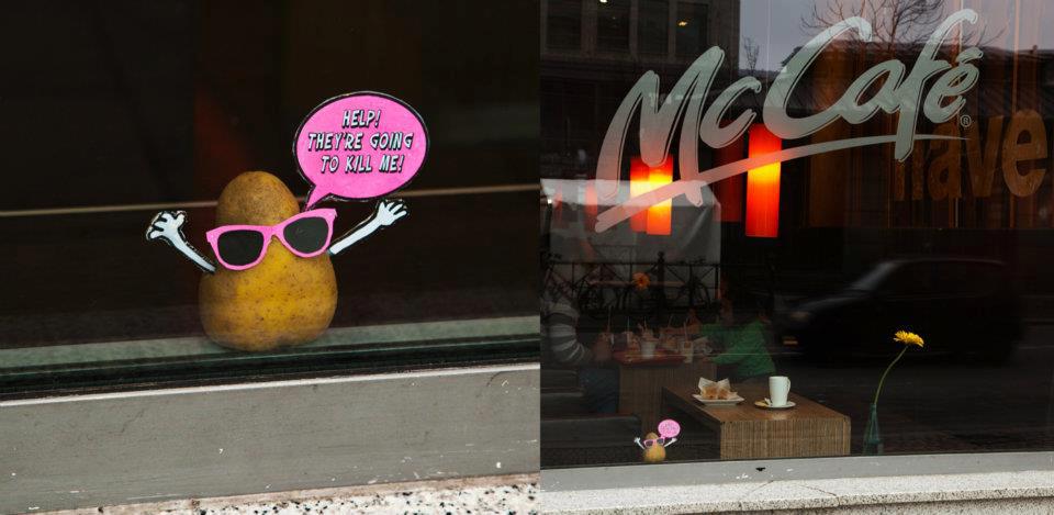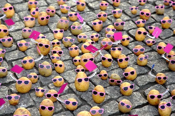 ใครจะไปเชื่อว่านี่คือ การประท้วงของมันฝรั่ง มันฝรั่งพวกนี้รวมตัวกันประท้วงที่หน้าร้าน McDonald’s ในกรุงเบอร์ลิน ด้วยความที่แฟรชม็อบตอนนี้ฮอตฮิตกันมากในเบอร์ลิน Peter Pink ศิลปินชาวเยอรมันเลยนำสิ่งยอดนิยมนี้มาเสียดสีเล็กๆ กับงานล่าสุดที่เขาประกาศเชิญทุกคนมาทำแฟลชม็อบประท้วงที่หน้าร้าน McDonald’s สาขา Berlin Neukolin โดยที่ทุกคนจะต้องเตรียมมันฝรั่งของตัวเองมาพร้อมกับ download รูปแว่นสีชมพูที่เป็นเอกลักษณ์ของนายคนนี้ แถมยังต้องโหลด แขนขา สัญลักษณ์ต่างๆ มาตั้งประท้วงพร้อมกันบนฟุตบาทหน้าร้าน แต่แฟลชม็อบของเขาก็ตั้งไม่ได้นาน เพราะสุดท้ายตำรวจก็มาจับนักประท้วงมันฝรั่งพวกนี้ไป ©