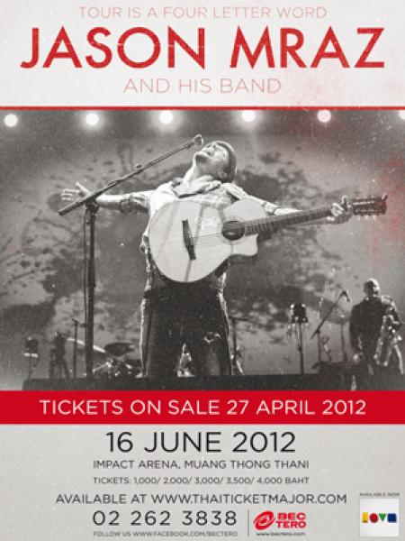 พลาดไม่ได้! สำหรับคอนเสิร์ตแบบเต็มวงเต็มอรรถรสทางดนตรีจาก เจสัน มราซ ซึ่งจะเกิดขึ้นในเมืองไทยใน เจสัน มราซ ทัวร์ อีส อะ โฟว์ เล็ตเตอร์ เวิร์ด ไลฟ์ อิน แบงคอก วันที่ 16 มิถุนายน ณ อิมแพค อารีน่า เมืองทองธานี บัตรราคา 1,000/ 2,000/ 3,000/ 3,500 และ 4,000 บาท มีจำหน่ายที่บูธไทยทิคเก็ตเมเจอร์ทุกสาขา ตั้งแต่วันที่ 27 เมษายนนี้เป็นต้นไป สอบถามรายละเอียดและข้อมูลเพิ่มเติมได้ที่ โทร. 02-262-3838 หรือwww.thaiticketmajor.com หรือ www.bectero.com
