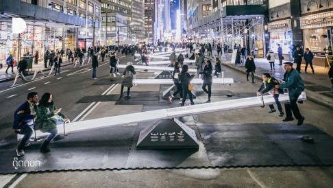 สมกับเป็น “เมืองที่ไม่เคยหลับไหล” สำหรับนครนิวยอร์ค กับการจัดแสดงงาน Public Art บนถนนบรอดเวย์ ระหว่างถนนคนเดินสาย 37 และ 38 ที่ล่าสุด Lateral Office สตูดิโอของแคนาดา ได้ติดตั้งกระดานหกขนาดใหญ่ ชื่อว่า ‘Impulse’ ทั้งหมด 12 ตัว แต่ละตัวมีความยาว 4.8 ถึง 7.3 เมตร วางเรียงส่องแสงสว่าง และสร้างเสียงดนตรี ดึงดูดให้ผู้คนเข้ามาเล่นสนุกกัน