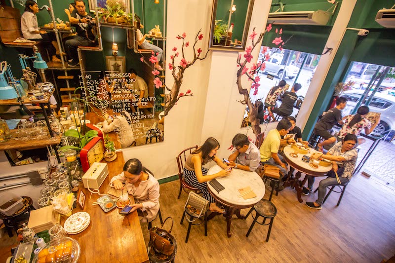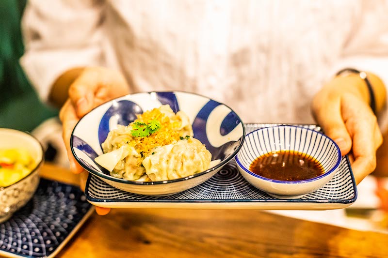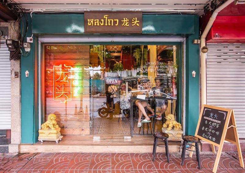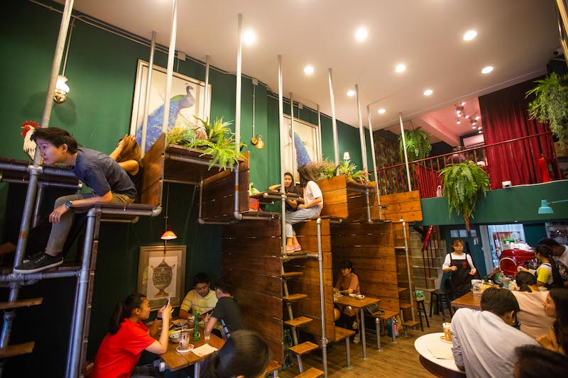 หนึ่งในคาเฟ่เจ้าของคิวแน่นเนืองบริเวณหน้าร้านที่ว่านั้นคือ ‘Lhong Tou’ คาเฟ่ที่อ่านด้วยแอคเซนต์ถูกต้องว่า ‘หลงโถว’ ตกแต่งแบบจีนย้อนยุค พื้นที่ขนาดตึกแถว 1 คูหา แค่มองด้วยตาเปล่าก็รู้ว่าแคบมาก แต่ก็ฉลาดมากเช่นกันที่ออกแบบภายในร้านให้มีพื้นที่ใช้สอยเยอะกว่าความเป็นจริงได้ขนาดนี้ ด้วยการเปิดเพดานให้สูงโล่ง ใช้กระจกเงาให้ความรู้สึกไม่อึดอับคับแคบ แล้วใช้โครงเหล็กกับไม้เสริมขึ้นไปเป็นที่นั่งประหนึ่งชั้น 2 ของร้านอีกที คนกินอย่างเราน่ะเหรอ ก็ต้องปีนบันไดเล็กๆ เหมือนรถไฟตู้นอน ดุ่ยๆ ขึ้นไป ซึ่งนอกจากจะเพิ่มพื้นที่อย่างแยบยล จุคนเข้าไปได้เยอะขึ้นแล้ว ยังทำให้รู้สึกสนุกเหมือนมีอะไรให้เเขนขาขยับเท่ากับออกกำลังด้วยนี่สิ (ไม่สูงมาก คนกลัวความสูงไม่เป็นปัญหา #ด้วยเกียรติของลูกเสือ)
