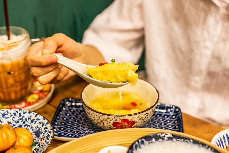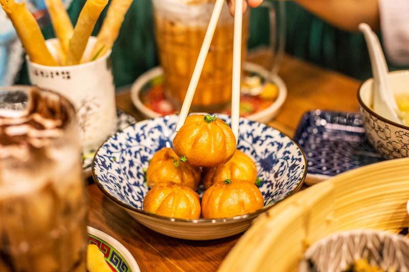 แต่ที่ยกให้เป็นความนิพพานของวันนี้ก็คือ ซาลาเปาทอดไส้หมูแดง กรอบนอก ซ่อนความเหนียวนุ่มของแป้งและชไส้หมูแดงหวานฉ่ำ กับซาลาเปาทอดไส้ไข่เค็มลาวาซึ่งออกหวานมัน ไม่ใช่หวานเลี่ยนจนเกินไป ที่สำคัญคือไม่คาว พอบิออกมาแล้วไส้ชิมไส้เยิ้มร้อนๆ คือพอแล้วพอ ชีวิตนี้…