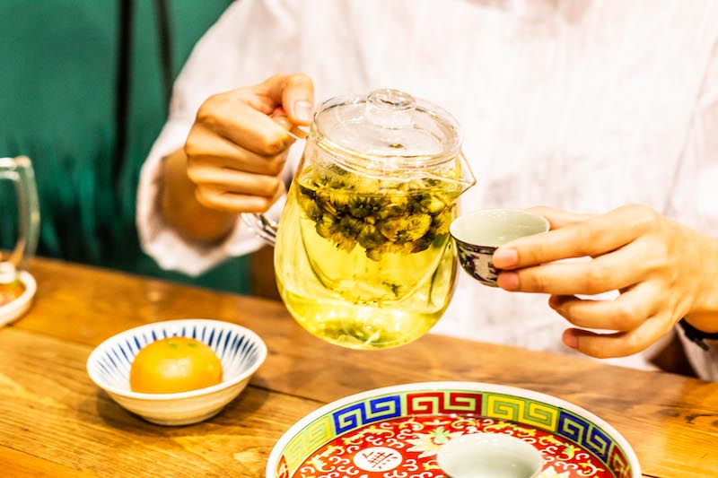 อาหารที่นี่อาจไม่ได้มีเยอะมาก แต่กลับไม่อยากร้องขออะไรอีก เพราะมัน ‘พอดี /กำลังดี /เข้ากันดี’ อย่างน่าชื่นชม ยิ่งสั่งชาชาดอกเก็กฮวยร้อนๆ มาซดหลายต่อหลายจอกเข้าไปด้วยอย่างเวลานี้แล้วนั้น บรรยากาศบนชั้น 2 ที่เรานั่งอยู่ยิ่งช่างสุขุมลุ่มลึก เยือกเย็น จนแทบอยากจะท่องบทกวีลมพัดชายเขาด้วยเสียงแบบทีมพากย์พันธมิตรเสียจริงๆ เลยละศิษย์พี่
