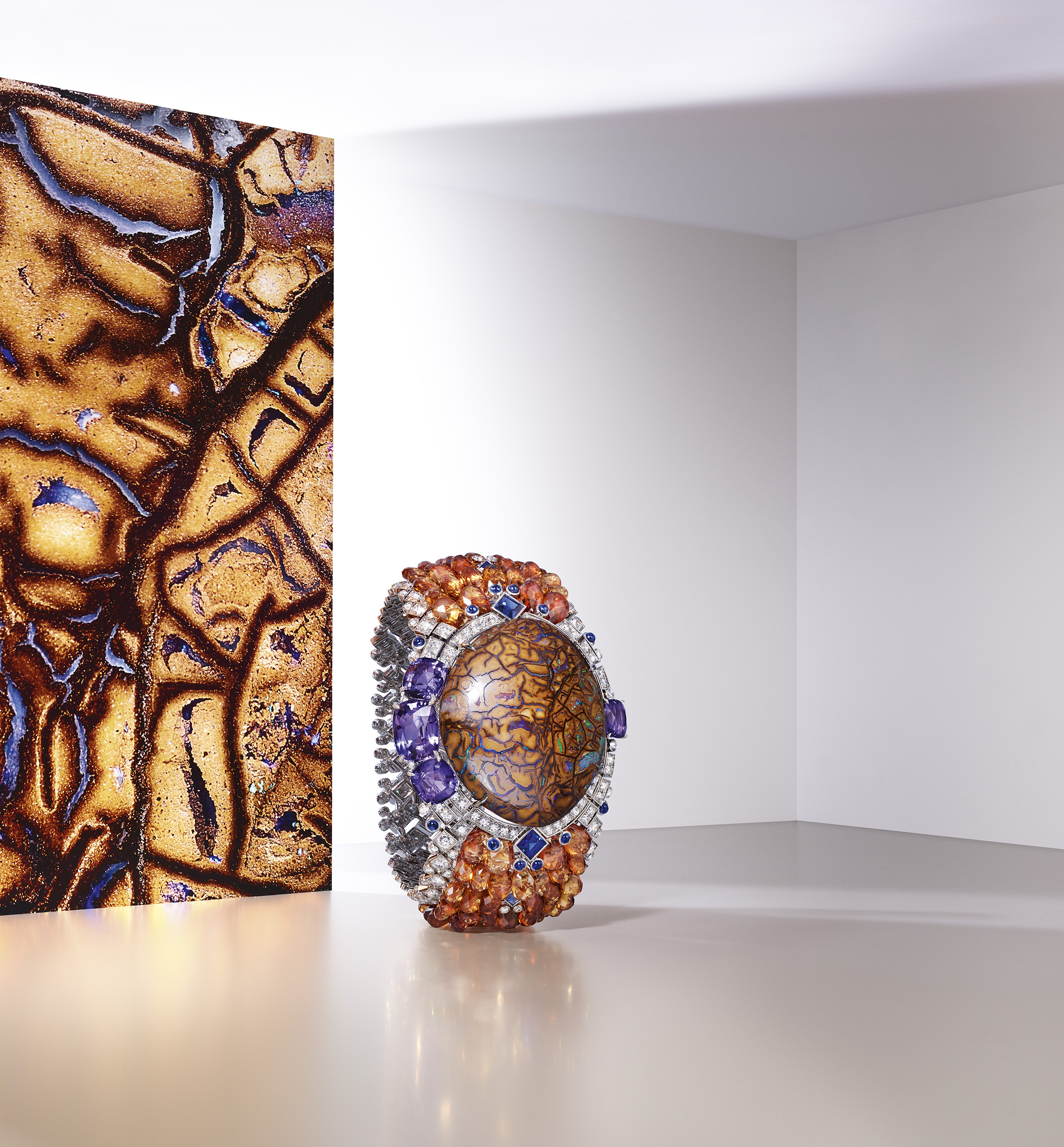 พลังของอัญมณีที่น่าหลงใหล เป็นตัวกำหนดการสร้างสรรค์เครื่องประดับชิ้นนี้ เริ่มตั้งแต่ การคัดสรรวัสดุให้สอดคล้องกับสีสันที่ต้องการ สีน้ำตาลพร้อมด้วยสีฟ้าน้ำทะเล ตลอดจนประกาบวับวามของสีม่วงประสานกันเป็นสีสันจากผืนโลกเมื่อมองจากอวกาศ เมื่อผสมผสานกับโอปอลที่อยู่ตรงกลาง สีสันเหล่านี้จึงส่งพลังกระจายไปยังกำไลทั้งชิ้น