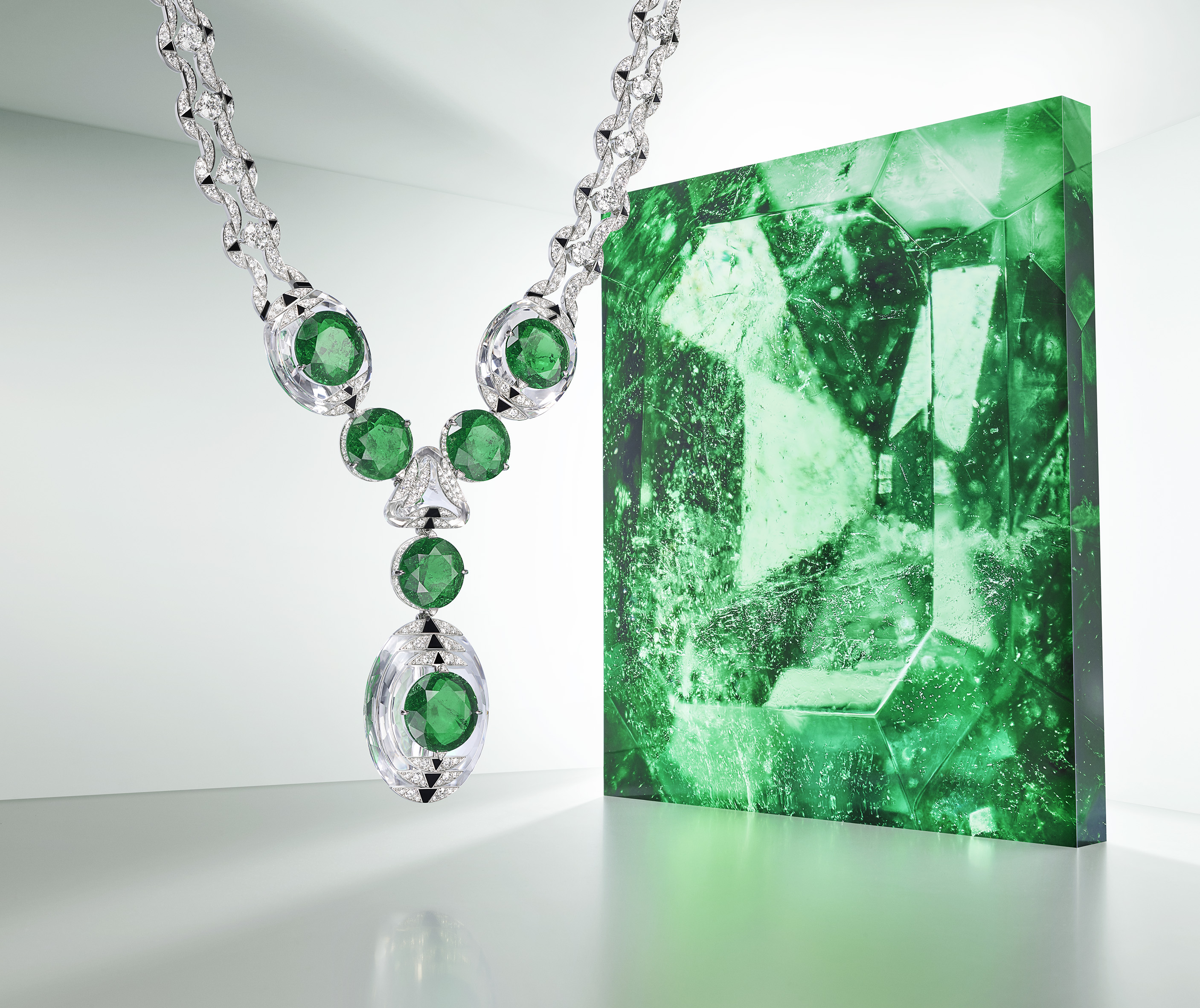 สร้อยคอ Théia วางรูปแบบให้มรกตจากโคลอมเบียเจียระไนทรงกลม 7 เม็ดอวดความงามสอดประสานกันอย่างโดดเด่น ช่างอัญมณีของคาร์เทียร์ได้วางอัญมณีที่ขึ้นชื่อเรื่องความอ่อนช้อยเหล่านี้ไว้ในอ้อมกอดของร็อค คริสตัล มรกตพบคู่ที่สมน้ำสมเนื้อที่สุดเมื่อปรากฏตัวคู่กับร็อคคริสตัล เนื่องจากทั้งสองต่างส่องประกายส่งรับกันเป็นระลอก ผิวด้านหลังของร็อคคริสตัลที่สัมผัสกับผิวหนังของผู้สวมได้รับการเจียระไนตลอดทั้งชิ้น เทคนิคนี้เป็นเคล็ดลับอย่างหนึ่งที่ช่วยเพิ่มประกายให้กับมรกตได้เป็นอย่างดี