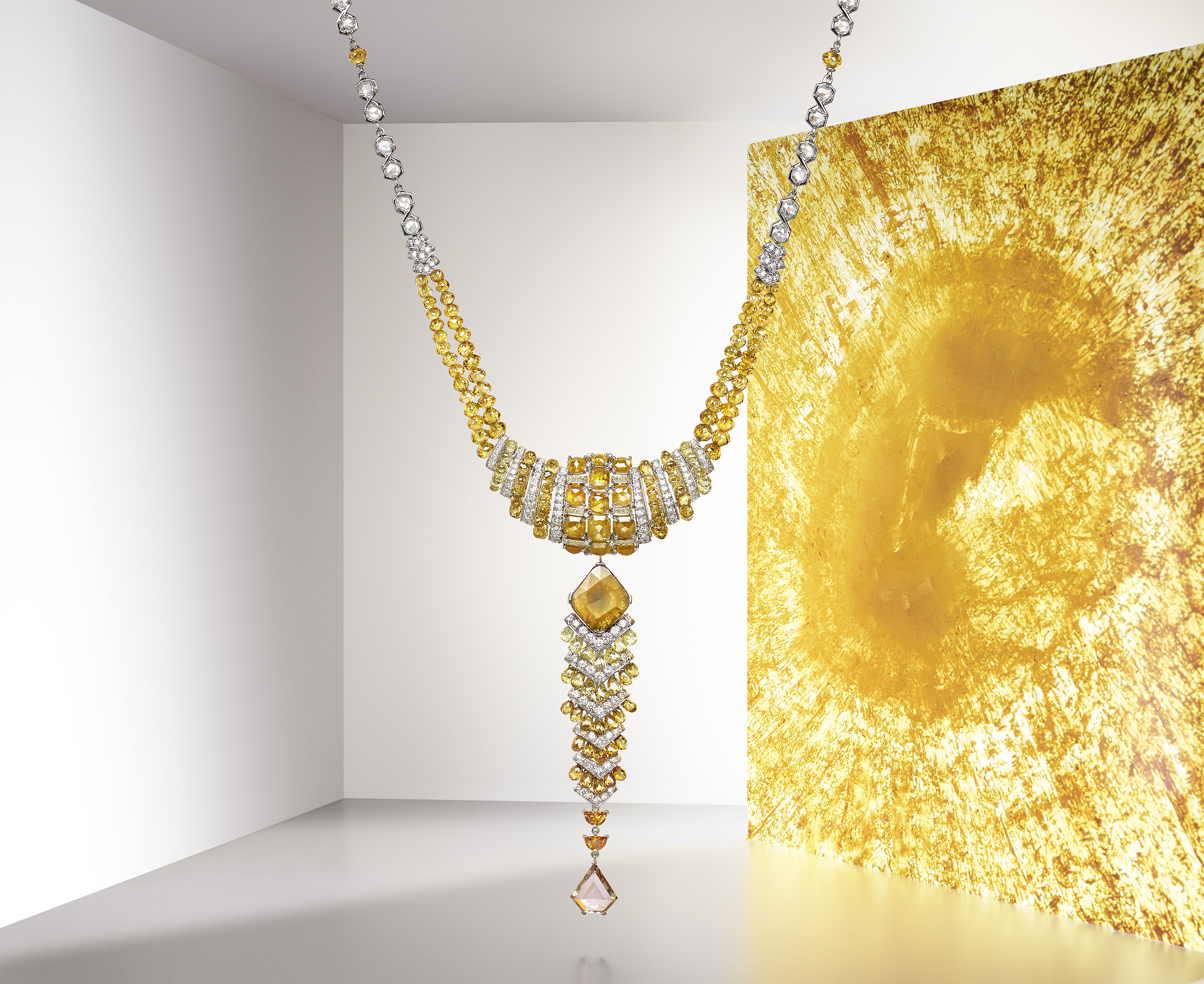 สร้อยคอ Yuma คาร์เทียร์ถ่ายทอดความหลากหลายของแสงตะวัน ไว้ในสีของเพชรที่ไล่เรียงตั้งแต่สีเหลืองทองไปจนถึงสีน้ำตาล การเจียระไนหลากหลายแบบ ลายเส้นกราฟฟิกดีไซน์ตลอดจนสีสันที่จัดจ้าน ล้วนช่วยขับความพร่างพรายให้เด่นชัดยิ่งขึ้น