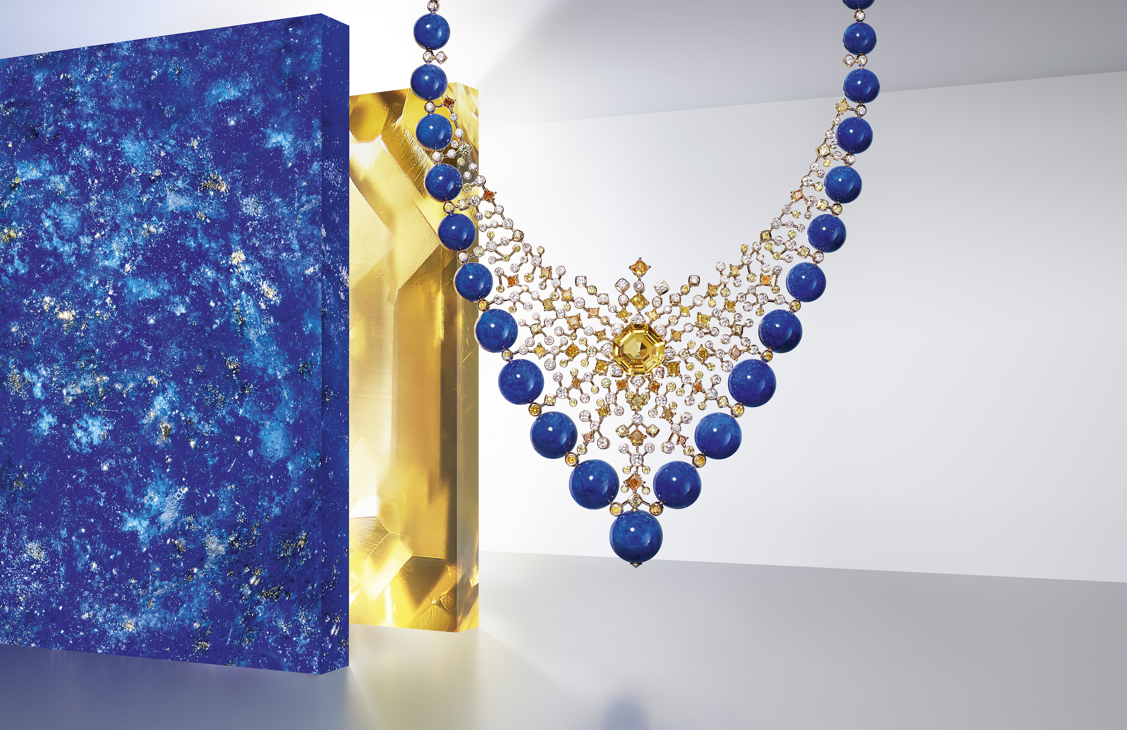 เพชรสีเหลือง ส้ม และขาว เป็นหมู่ดาวที่เรียงตัวเป็นลายโปร่งเสมือนผ้าลูกไม้ซึ่งส่องแสงระยิบระยับอยู่บนผิว นี่คือชิ้นงานสร้างสรรค์ที่คาร์เทียร์นำเสนอดีไซน์ในแบบที่เกิดขึ้นไม่บ่อยนัก ของลูกปัดลาพิสลาซูลี ซึ่งในเนื้อมีแร่ไพไรต์ผสม ให้ผลที่ดูสวยงดงาม ลาพิสลาซูลีแสดงถึงสีน้ำเงินอันลึกล้ำของห้วงอวกาศและท้องฟ้าที่เต็มไปด้วยดวงดาวในยามค่ำคืน
