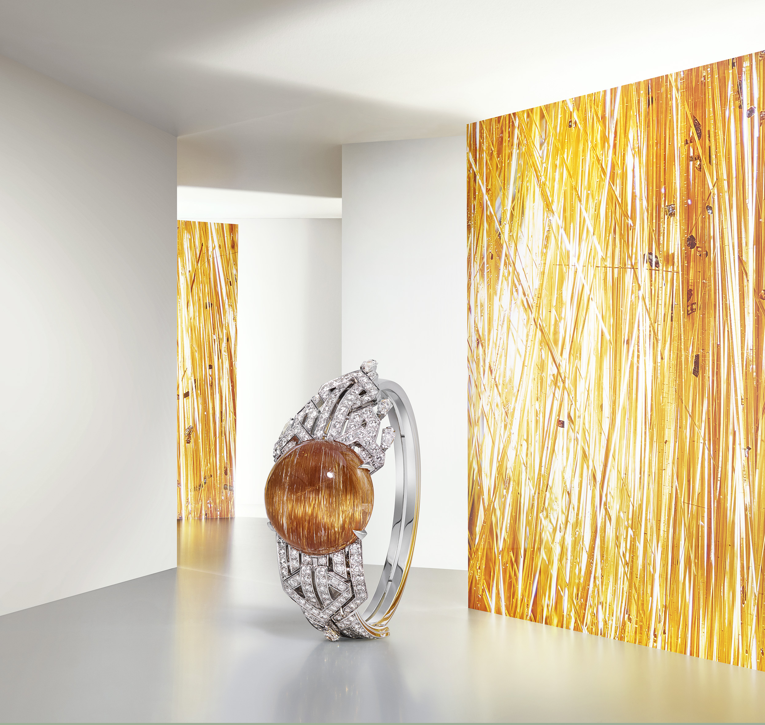 คาร์เทียร์ได้เลือกควอตซ์ทรงคาโบชงซึ่งโดดเด่นไปด้วยเส้นไหมแร่ฝังภายใน ไว้เป็น Center Stone คาร์เทียร์เลือกหินกึ่งโปร่งแสงชนิดนี้มาประกอบในนาฬิกา Soreli Secret Watch เพราะความเรืองรองโทนสีน้ำผึ้งและโค้งมนของคาโบชง โดยขนาบด้วยเพชรเจียระไน Brilliant Cut อัญมณีที่เต็มไปด้วยเส้นแสงชิ้นนี้ส่องประกายระยิบระยับอย่างมีชีวิตชีวา
