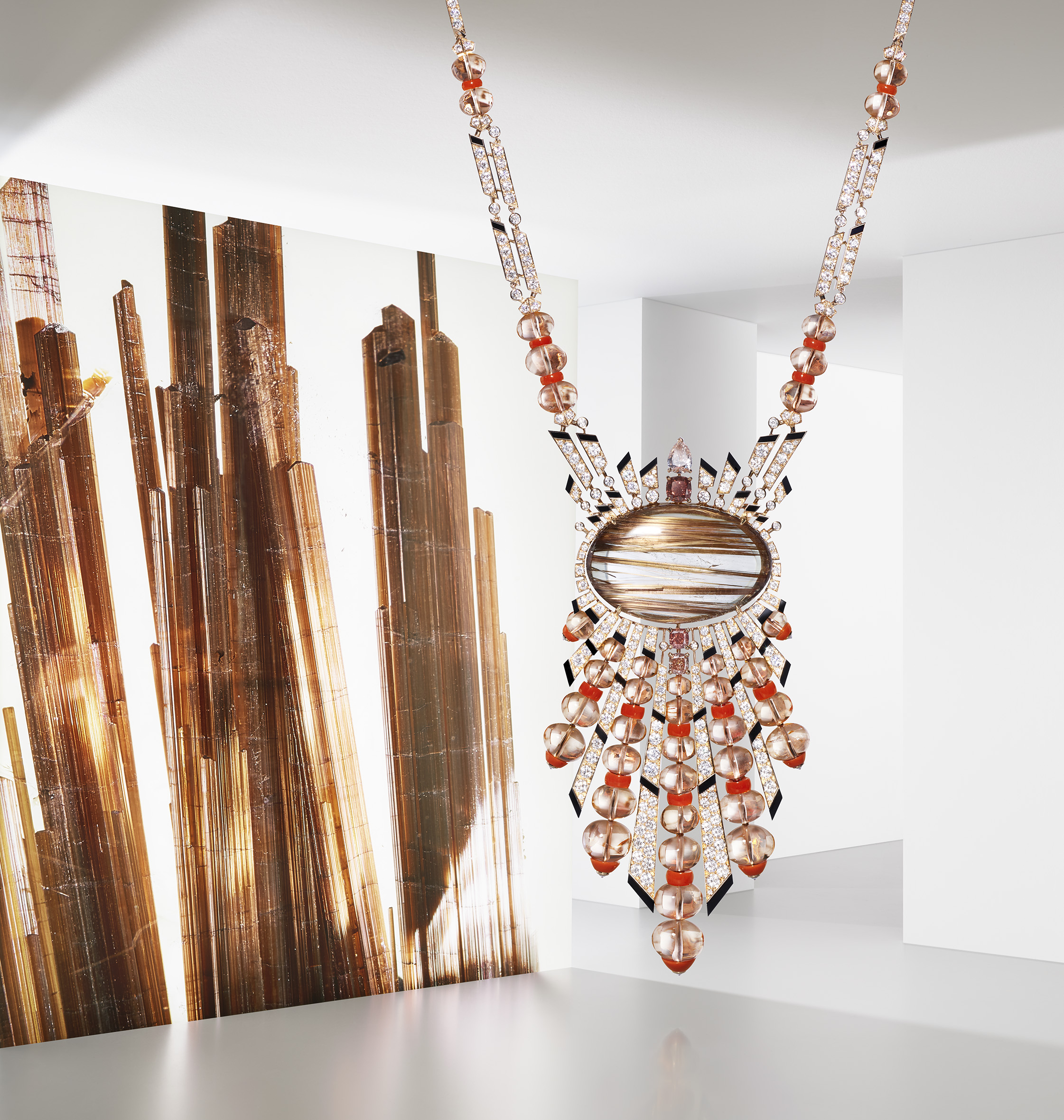 รูปทรงเรขาคณิตและภาพลวงตาที่เกิดจากดีไซน์นี้มาจากการปรับใช้หลักการทางจลนศิลป์ (Kinetic Art) ไล่เรียงตั้งแต่สีสันที่ตัดกันไปจนถึงการใช้ความโปร่งแสงได้อย่างช่ำชอง สีเขียวและสีดำคือคู่สีที่เป็นซิกเนเจอร์ของคาร์เทียร์ โดยมีโอนิกซ์คอยเบรกดีไซน์ รูปแบบที่เกิดขึ้นซ้ำๆ ตลอดจนหินที่ใช้ ชักนำให้แสงแฉลบสะท้อนเป็นจังหวะไม่รู้จบ จี้ของสร้อยคอสามารถถอดแยกออกเพื่อใช้เป็นเข็มกลัดหรือใช้ร่วมกับสร้อยอื่นๆ ตามสไตล์เครื่องประดับของเมซงคาร์เทียร์ที่ปรับเปลี่ยนรูปแบบการใช้งานได้ ด้านหน้าและด้านหลังของชิ้นงานมีความสวยงามเช่นเดียวกันดังที่ชิ้นงานของคาร์เทียร์เป็นอยู่เสมอมา