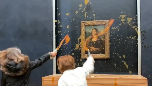 นักเคลื่อนไหวสองคนที่เกี่ยวข้องกับกลุ่มสิ่งแวดล้อม Riposte Alimentaire จัดการประท้วงปาซุปเพื่อต่อต้าน โมนาลิซ่า งานศิลปะอันโด่งดัง โดยให้เหตุผลว่า มีจุดมุ่งหมายเพื่อเน้นย้ำความกังวลเกี่ยวกับการผลิตอาหารที่ไม่ยั่งยืน ( unsustainable food production )ในฝรั่งเศส โดยผู้ประท้วงขว้างซุปสีส้มไปที่ภาพวาด