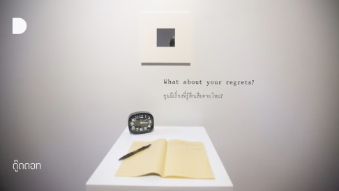 คราวนี้เรามาเพื่อดูนิทรรศการที่เธอลงมือเก็บข้อมูลเองและเป็นศิลปินเองชื่อ ‘The Unspoken Word’ งานเชิงทดลองอันเกิดจากประสบการณ์ของตัวเองเมื่อครั้งไปเรียนต่อปริญญาโทด้าน Curating Art ณ ประเทศอังกฤษ ความเหงาอย่างคนไกลบ้านทำให้เธอตั้งคำถามมากมายถึงการมีชีวิตอยู่ และสิ่งที่มาคู่กัน...ความตาย