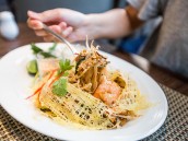 ก่อนที่เราจะสั่งอาหาร ขอสั่งดริ๊งค์มาดื่มให้ชื่นใจกันก่อนดีกว่า ที่ Lady Brett มีเครื่องดื่มให้เลือกสั่งอย่างหลากหลาย ไม่ว่าจะเป็นพวกม็อกเทล เบียร์ ไซเดอร์ ค็อกเทล ไวน์ และน้ำอัดลม น้ำผลไม้ หรือแม้กระทั่งชา กาแฟ สำหรับใครที่ไม่ถนัดดื่มแอลกอฮอล์ แต่มาถึงที่นี่ทั้งที เราไม่ขอพลาดชิมค็อกเทลที่มิกซ์ใหม่ขึ้นทั้งหมด โดยได้ Phillip Stefanescu บาร์เทนเดอร์ที่ส่งตรงมาจากสตอกโฮล์ม มาช่วยครีเอทเมนูเครื่องดื่มใหม่ๆที่ไม่ซ้ำใคร โดยในครั้งนี้ Phillip ได้แนะนำให้เราชิมถึง 3 ค็อกเทลด้วยกัน ได้แก่ “From London to Bangkok” ค็อกเทลชื่อเก๋ไก๋ ที่มีส่วนผสมของยิน แตงกวาสด โหระพา น้ำตาล และมะนาวจำนวนอีกเล็กน้อย แก้วนี้จะหอมอบอวลไปด้วยกลิ่นแตงกวา รสชาติของค็อกเทลจะออกหวานอมเปรี้ยวนิดๆ โดยรวมเป็นแก้วที่มีรสอ่อนๆ ดื่มเพื่อความสดชื่น ต่อด้วย “Negrita” ที่มีส่วนผสมของ tequila เหล้า aperol ส้ม และตกแต่งด้วยเปลือกเกรปฟรุต แก้วนี้จะมีความแรงขึ้นมาหน่อย มีรสชาติหวานอมขมนิดๆ หอมกลิ่นส้ม และปิดท้ายด้วย “Conquistador” ซึ่งเป็นอีกเวอร์ชั่นของ Sangria ที่ทางร้านคิดค้นขึ้นมาใหม่ กับส่วนผสมของโฮมเม้ด ไซรัป ไวน์แดง สตรอว์เบอร์รี่ แอปเปิ้ล และส้ม มีรสชาติของความหวานปนเปรี้ยวนิดๆกำลังดี ดื่มแล้วรู้สึกเย็นสดชื่นถึงใจ ความเหนื่อยทั้งหลายแหล่ที่สะสมมาทั้งวันนั้นหายเป็นปลิดทิ้ง