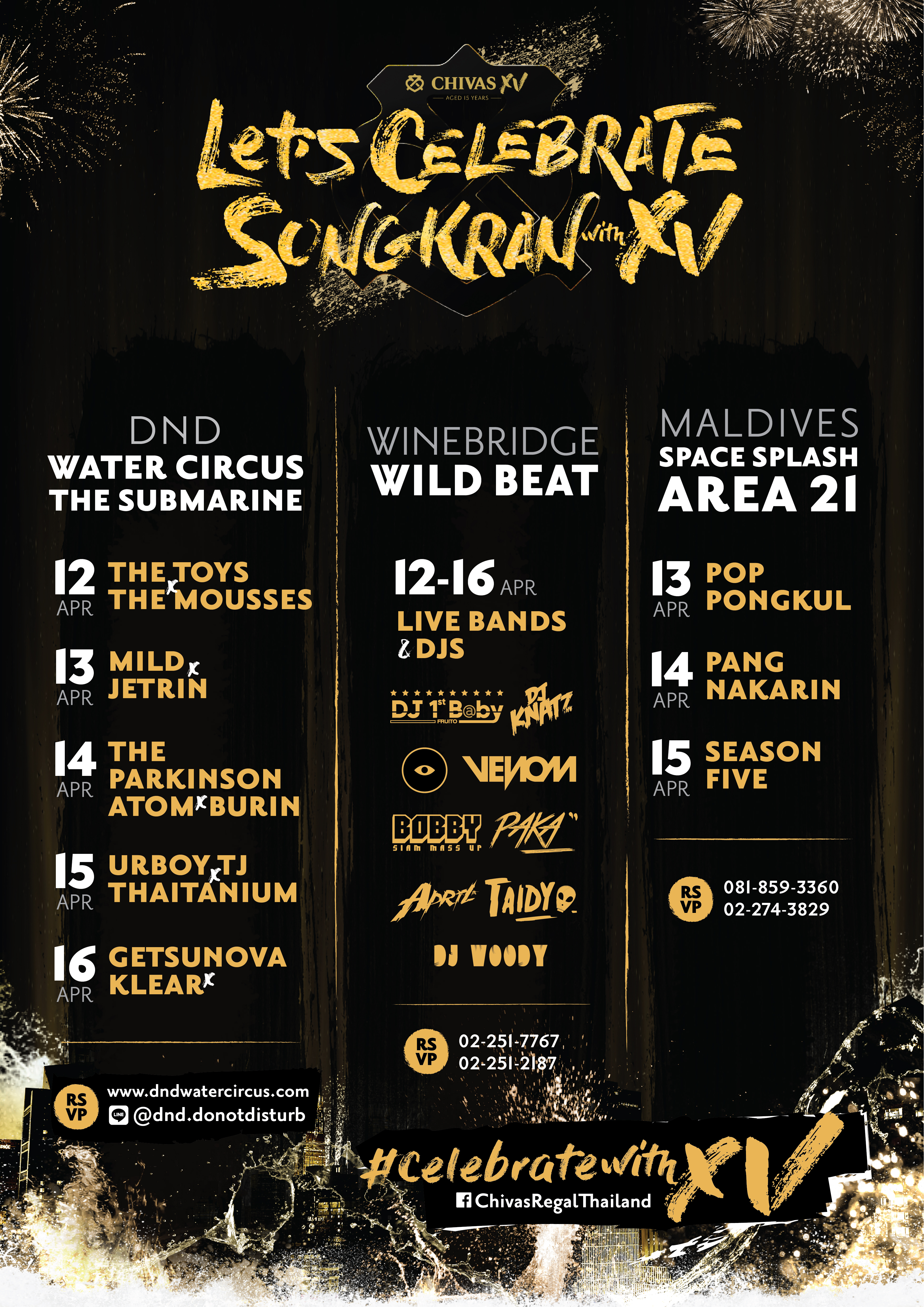 Chivas XV Songkran Festival 2019 ปีนี้ยกขบวนความมันส์เหนือระดับกว่าที่เคย พบกับเทศกาลสงกรานต์ที่พิเศษกว่าครั้งไหนๆ ด้วยปาร์ตี้ที่ชวนคุณและผองเพื่อนมาเฉลิมฉลองกันแบบเย็นฉ่ำกับ3 ที่เด็ดจาก 3 ย่าน พร้อมมาในธีมที่รับรองความสนุกไม่ซ้ำแบบ อัดแน่นไปด้วยศิลปินคุณภาพและดีเจระดับท็อปของประเทศที่คัดมาแล้วให้เหล่าสาวกที่ตั้งหน้าตั้งตารอได้สนุกกันอย่างจุใจ มาเริ่มกันที่สถานที่ฮอทฮิตย่านแรกอย่างเพลินจิตที่พลาดไม่ได้ “Wine Bridge Plus” (ไวน์ บริดจ์ พลัส) ลุยกันยาวๆตั้งแต่วันที่ 12-16 เมษายน ปีนี้ชวนมาระเบิดความสนุกยิ่งกว่าที่ผ่านมาในธีม “Wild Beat” ที่ยกเอาป่าตื๊ดสุดเดือดมาไว้ใจกลางกรุง ปลุกวิญญาณ Party Animal ไปกับบีทสุดมันส์ โดยในแต่ละวันก็มีธีมแซ่บๆแตกต่างกัน 5 วัน 5 ธีม ไม่ว่าจะเป็น อสรพิษ, ป่าตื๊ด, ดีออก, น้ำป่า, น้ำหนาว ให้ชาวแก๊งมาเลือกปล่อยความมันส์ได้ตามสไตล์ พร้อมเนรมิตสระน้ำขนาดใหญ่ซึ่งเป็นซิกเนเจอร์ของไวน์ บริดจ์ พลัสที่นำมาให้ทุกคนสนุกกันเฉพาะในช่วงวันสงกรานต์เท่านั้น ที่ดีไซน์ออกมาเสมือนได้สาดน้ำกันท่ามกลางป่าแนวทรอปิคัลกันจริงๆ นอกจากจะได้สาดน้ำกันแบบไม่ยั้งแล้วยังมีปาร์ตี้โฟมแบบจัดเต็ม พบกับ Live Band วงดนตรีมืออาชีพมากมายมาร่วมสร้างสีสันในทุกคืน พร้อมมันส์ไปกับเหล่าดีเจชื่อดังกว่า10 ไลน์อัพ อาทิ Bobby, 1st Baby Fruito, Venom, Taidy, Knatz, Paka, Woody, Aprtl, DJ YP