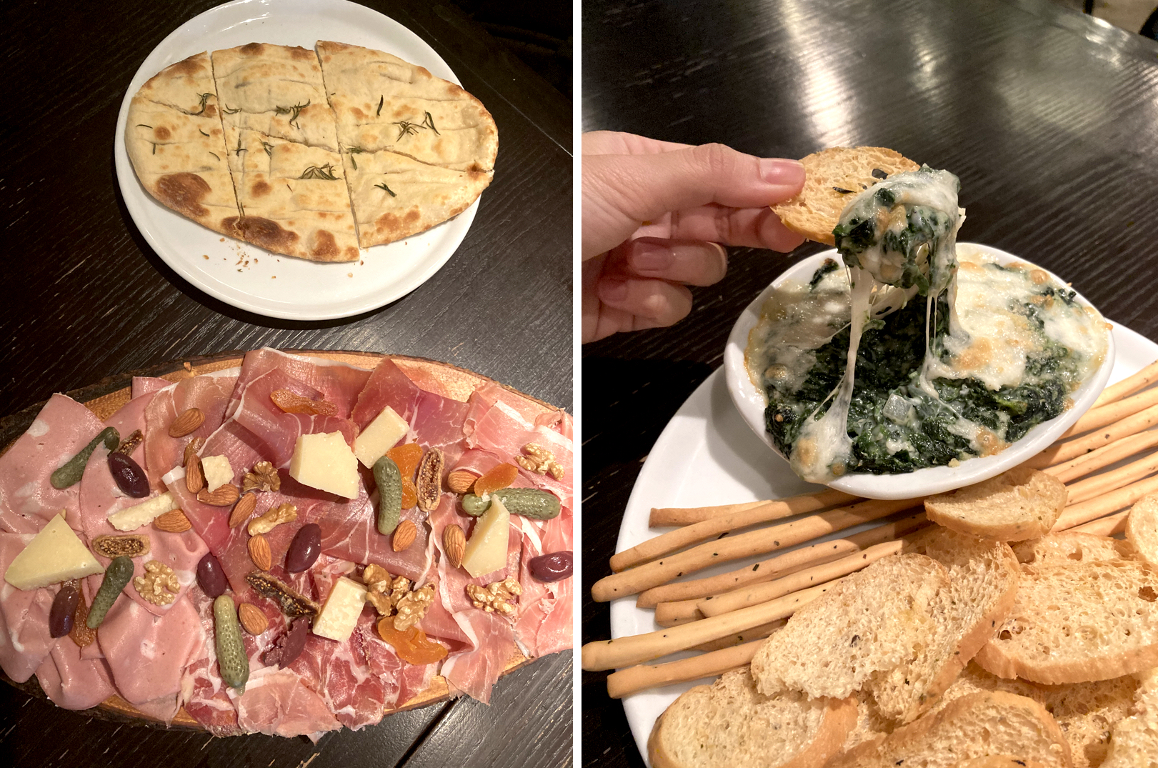 Ciao Mixed Cold Cuts เริ่มต้นด้วยจาน Cold Cuts แบบจัดเต็ม มีทั้งพาร์ม่าแฮม ไส้กรอกมอร์ตาเดลลา และคอปปาแฮม เสิร์ฟกับวอลนัท แอปปริคอท ลูกมะเดื่อ มะกอก และเกอร์กิ้น เสิร์ฟมาพร้อมกับจานเรียกน้ำย่อยอีกอย่าง นั่นก็คือ Hot Spinach Dip ผักโขมอบชีสร้อนๆ ยืดๆ โรยด้วยพาเมซานชีส เสิร์ฟพร้อมกับ ขนมปังกระเทียมอบกรอบ