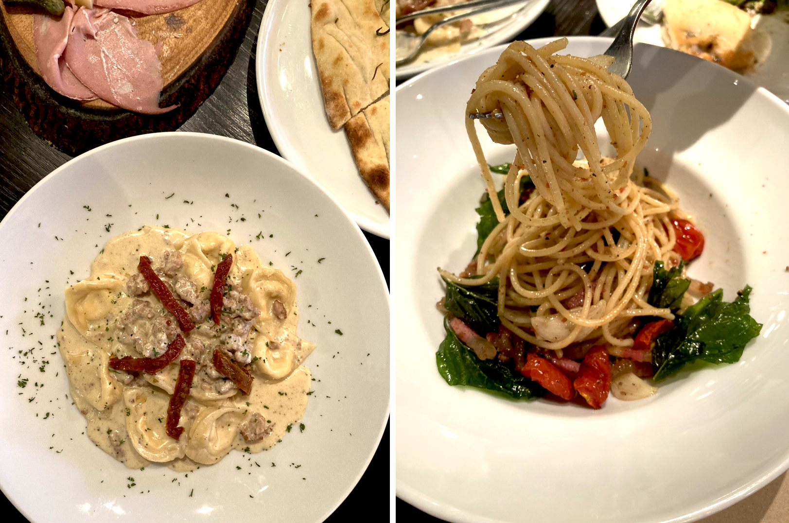 เมื่อมาถึงอิตาเลียนทั้งที งานเกี๊ยวก็ต้องมา! Ravioli Di Scamorza Al Tartufo ราวิโอลีโฮมเมดสอดไส้ชีสรมควันและชีสริคอตตา เสิร์ฟในซอสครีมเห็นทรัฟเฟิลกลิ่นหอมละมุน มากับ Spaghetti A.O.P. Guanciale สปาเกตตี้เบคอนกวนชาเล และมะเขือเทศเชอร์รี่ผัดกับน้ำมันมะกอก กระเทียม และพริกแห้งเเซ่บๆ หน่อย ช่วยตัดเลี่ยนได้เป็นอย่างดี