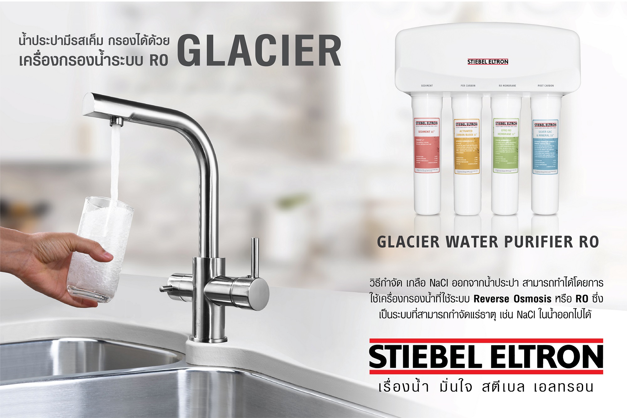 เครื่องกรองน้ำ Glacier เป็นเครื่องกรองน้ำระบบ Reverse Osmosis (RO) จาก สตีเบล เอลทรอน ที่มีขนาดกะทัดรัดแต่มาพร้อมกับคุณสมบัติการกรองน้ำขั้นสูง และการออกแบบทางวิศวกรรมที่ได้รับการรับรองจากทางเยอรมนี เพื่อให้ผู้ใช้งานสามารถมั่นใจได้ว่าน้ำดื่มที่ได้นั้นสะอาดและปลอดภัย ด้วยวัสดุเยื่อกรอง Eco Friendly RO (EFRO) เยื่อกรองชนิดพิเศษจาก สตีเบล เอลทรอน ที่ได้รับการจดสิทธิบัตรแล้วว่าเป็นเยื่อกรองที่ช่วยลดอัตราการสูญเสียน้ำได้ถึง 50 เปอร์เซ็นต์ สามารถกำจัดเชื้อไวรัสและแบคทีเรีย นำกร่อยและน้ำเค็ม รวมถึงโลหะหนัก อาทิ ตะกั่ว ทองแดง อลูมินั่ม เซเลเนี่ยม สังกะสี เหล็ก และเกลือโซเดียมคลอไรด์ ในน้ำออกไปได้ นอกจากนี้ เครื่องกรองน้ำ Glacier ยังมาพร้อมกับฟังก์ชั่น “Twist” โดยผู้ใช้สามารถเปลี่ยนไส้กรองได้สะดวกและง่ายดาย เพียงแค่หมุนแล้วเปลี่ยนไส้กรองโดยไม่ต้องใช้อุปกรณ์ใด ๆ ให้ยุ่งยาก อีกทั้งยังสามารถติดตั้งได้ทั้งใต้ซิงค์ล้างจาน หรือบนผนัง
