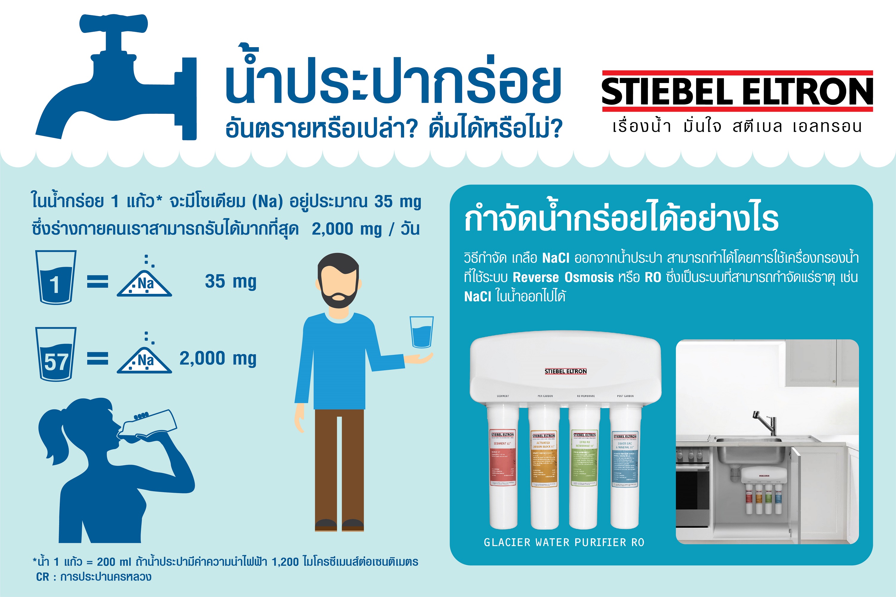 เป็นเรื่องที่น่าสนใจไม่น้อยสำหรับปัญหาภัยแล้ง ซึ่งภัยแล้งในปี 2563 นี้ที่เกิดขึ้นรวดเร็วกว่าปีที่ผ่าน ๆ มา และยังมีการรายงานข่าวน้ำทะเลหนุนอยู่บ่อยครั้ง ส่งผลกระทบทำให้น้ำประปากร่อยอันเนื่องมาจากน้ำทะเลที่ผสมอยู่ในน้ำดิบ ซึ่งในน้ำกร่อย 1 แก้ว (200 มิลลิลิตร) จะมีปริมาณโซเดียมคลอไรด์ (Na) อยู่ที่ 35 มิลลิกรัม ซึ่งร่างกายคนเราสามารถรับได้มากสุดที่ 2,000 มิลลิกรัมต่อวัน ซึ่งถ้าเราดื่มน้ำประปากร่อยที่ไม่ผ่านการกรองวันละ 10 แก้ว นั้นหมายความว่าเราดื่มปริมานโซเดียมไป 350 มิลลิกรัม ซึ่งถือเป็นปริมาณที่สูงมาก การจำกัดโซเดียมคลอไรด์ในน้ำจึงเป็นสิ่งที่จำเป็น เพราะในชีวิตประจำวันเราได้รับโซเดียมคลอไรด์เป็นจำนวนมากอยู่แล้วจากการรับประทานอาหารประเภทอื่น โดยวิธีการกำจัดโซเดียมคลอไรด์ในน้ำ สามารถทำได้โดยการใช้เครื่องกรองน้ำที่มีระบบ Reverse Osmosis หรือ RO ซึ่งสามารถช่วยกำจัดแร่ธาตุต่าง ๆ รวมถึงอย่างโซเดียมคลอไรด์ และรสชาติเค็มจากเกลือออกไปได้