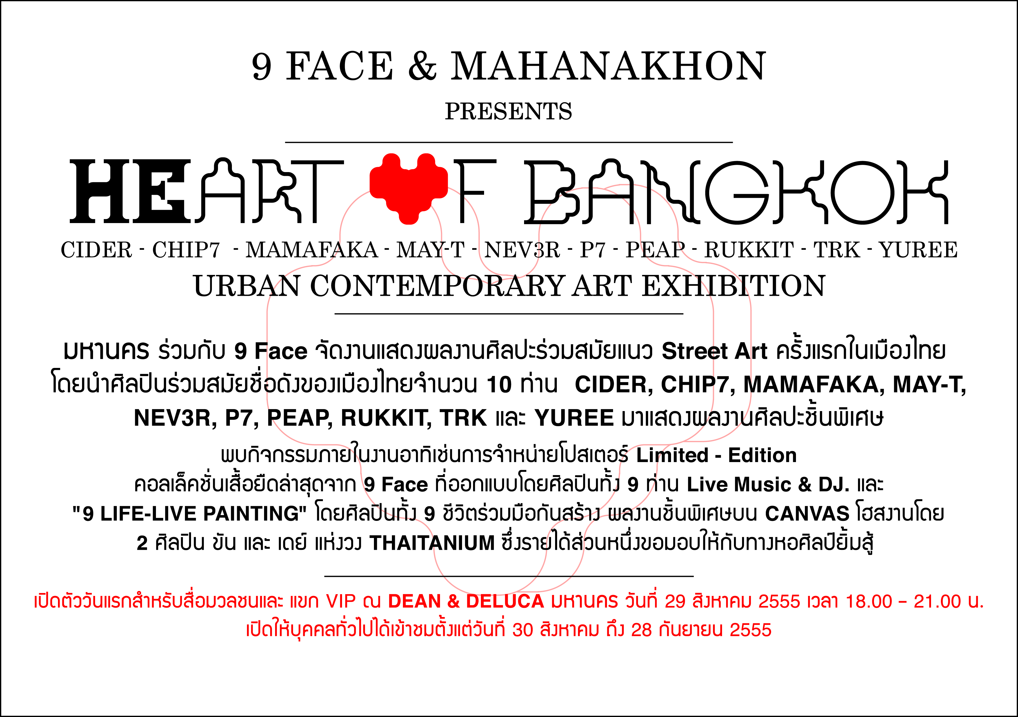 โดยกิจกรรมทางศิลปะดังกล่าวจะ เปิดตัวในวันที่ 29 สิงหาคม 2555 เวลา 18.00 น. ที่ร้าน Dean & Deluca มหานคร (invitation only) ซึ่งในวันงานเปิดจะได้พบกับ 2 ศิลปินฮิปฮอป จาก วงไทยเทเนี่ยม ขัน, เดย์ 2 ผู้ก่อตั้งแบรนด์ เสื้อผ้า 9face รวมทั้ง คุณบ็อบบี้-โรเบิร์ต พูลพิพัฒน์ , คุณต่าย-นิทรา กิติยากร ณ อยุธยา และ คุณเท็ด-ถิระพัฒน์ โปษะกฤษณะ 3 หุ้นส่วนคนสำคัญของแบนรด์ 9 Face มาร่วมงานในครั้งนี้ด้วย