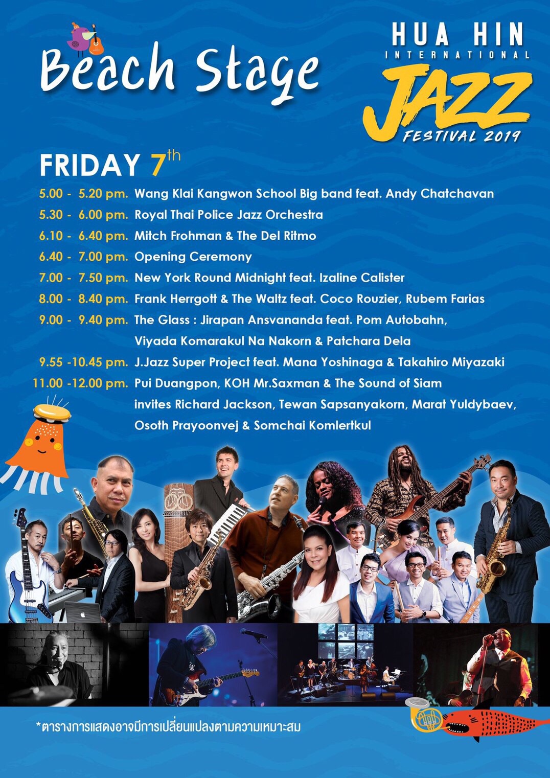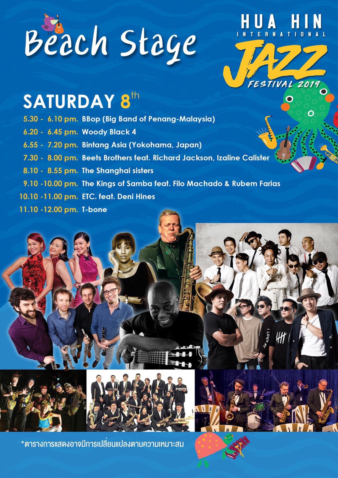 สำหรับการจัดงานในครั้งนี้ มีศิลปินแจ๊สระดับโลกมาจากหลายประเทศ อาทิ King of Samba สุดยอดวงบราซิเลี่ยนแจ๊สที่จะมาสร้างความสนุกสนานร่วมกับ Rubem Farias หนึ่งในนักเล่นเบสที่ดีที่สุดในโลก โดยไฮไลท์ของปีนี้ Deborah Brown แจ๊ส DIVA แถวหน้าของโลกที่จะมาแต่งแต้มสีสันให้หาดหัวหินด้วยเสียงร้องที่ทรงพลังและเต็มไปด้วยมนต์เสน่ห์ สัมผัสประสบการณ์แจ๊สกันอย่างถึงแก่นกับโชว์สุดพิเศษของบิ๊กแบนด์ระดับโลก New York Round Midnight และ Beets Brothers กลุ่มนักดนตรีแจ๊สแถวหน้าจากเนเธอร์แลนด์ เคลิบเคลิ้มไปบทเพลงที่คุ้นหูของ เติ้ง ลี่ จวิน ในแบบเซี่ยงไฮ้แจ๊สโดยกลุ่มศิลปินจากมาเลเซีย The Shanghai Sisters ร่วมด้วย Mitch Frohman สุดยอดนักแซกโซโฟนเจ้าของเพลงประกอบซีรี่ย์เรื่องดัง Sex and the City และกลุ่มศิลปินแจ๊สรุ่นใหม่จากแดนอาทิตย์อุทัยที่รวมตัวกันสำหรับงานนี้โดยเฉพาะกับ J.Jazz Super Project (The Next Century of J.Jazz)