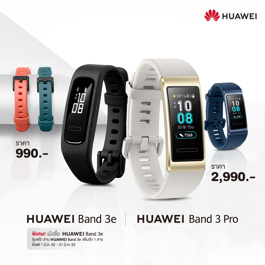 HUAWEI Band 3 Pro และ HUAWEI Band 3e พร้อมวางจำหน่ายอย่างเป็นทางการตั้งแต่วันที่ 1 มีนาคม ที่ หัวเว่ย เอ็กซ์พีเรียนซ์ สโตร์ ร้านตัวแทนจำหน่ายที่ร่วมรายการ และร้านค้าออนไลน์ โดย HUAWEI Band 3 Pro วางจำหน่ายในราคา 2,990 บาท มีให้เลือกสองสี ได้แก่ Space Blue และ Quicksand Gold ส่วน HUAWEI Band 3e วางจำหน่ายในราคา 990 บาท มีให้เลือกสองสี ได้แก่ Black และ Pink และสามารถเลือกเปลี่ยนสายรัดข้อมือได้ โดย Color Strap วางจำหน่ายในราคา 190 บาท มีให้เลือกห้าสี ได้แก่ Black, Pink, Orange, Cyan and Grey พิเศษ! เมื่อซื้อ HUAWEI Band 3e สี Black รับฟรี สายรัดข้อมือสี Orange หรือเมื่อซื้อ HUAWEI Band 3e สี Pink รับฟรี สายรัดข้อมือสี Cyan ตั้งแต่วันที่ 1 – 31 มีนาคมนี้ เท่านั้น