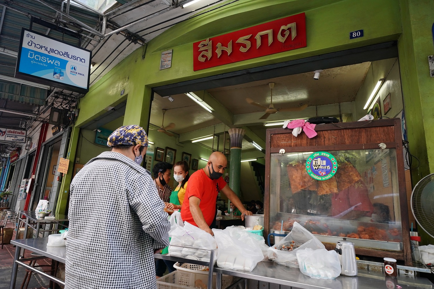 หากพูดถึงซอยสุกร 1 ย่านตลาดน้อย ที่เหล่าคนรักการกินจะต้องรู้จักกันดีในชื่อ ‘ตรอกโรงหมู’ ซึ่งเป็นที่ตั้งของร้านหมูแดงสีมรกตที่เปิดมาแล้วกว่า 60 ปี คุณพ่อเปี๊ยก เจ้าของร้าน คือผู้สานต่อปณิธานของพ่อ จากข้าวหมูแดงหาบเร่–แผงลอยสู่ห้องแถว แต่ยังคงตั้งราคาอาหารตามมาตรฐานตลาด ที่มาพร้อมคุณภาพอาหารคับจาน ซึ่งเสน่ห์ของร้านหมูแดงสีมรกต มาจากรสชาติหมูแดงที่ผ่านการหมักด้วยสมุนไพรย่างด้วยไฟกำลังพอดีทำให้มีความหอมและรสชาติอมหวานซึมเข้าไปตามเนื้อหมูแดง กับหมูกรอบเนื้อแน่นมันน้อยหนังกรอบแฝงได้ด้วยรสเค็มอ่อน ๆ และน้ำราดสูตรเด็ดประจำตระกูลที่ตรึงใจลูกค้ามาหลายยุคหลายสมัย