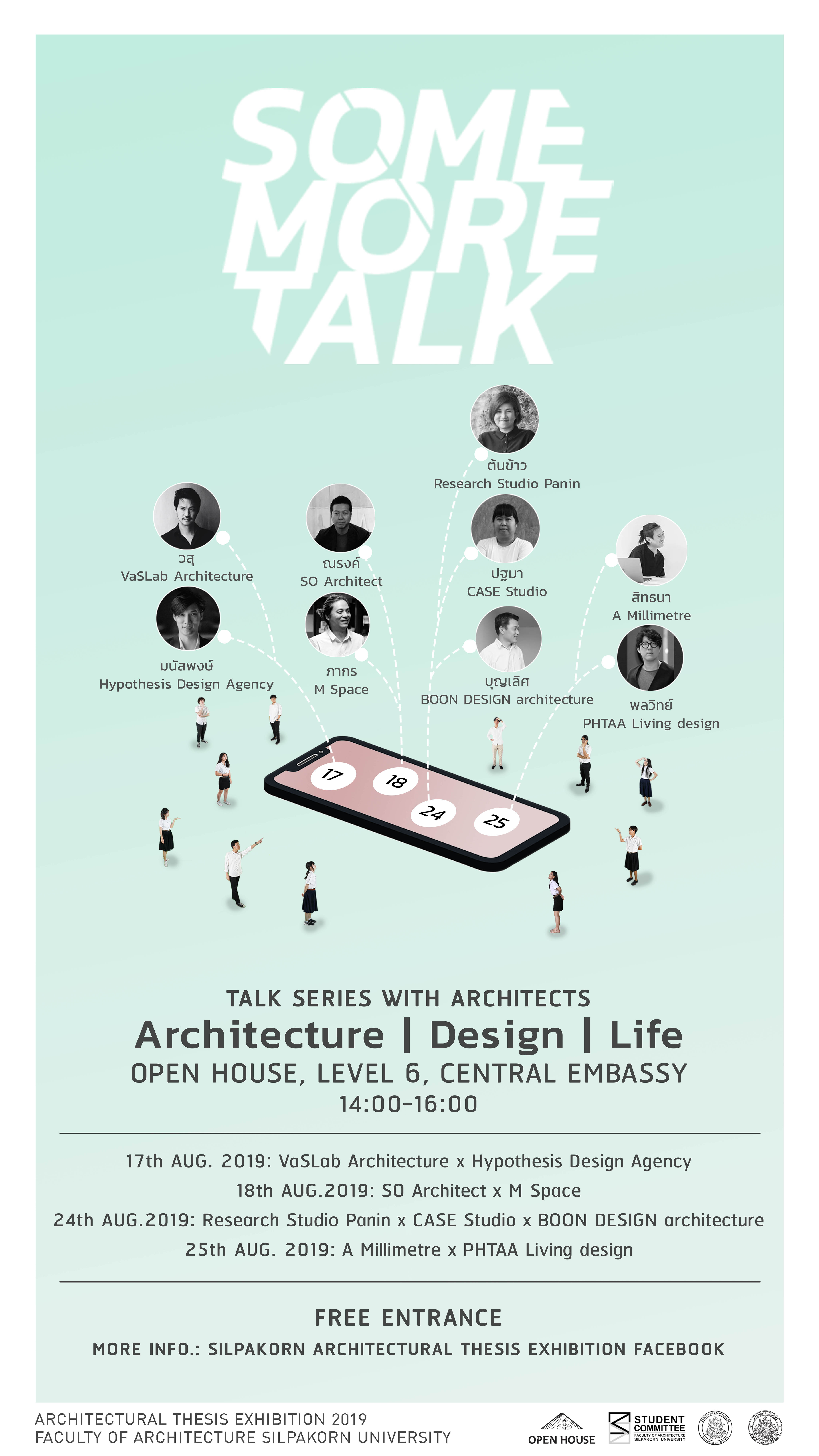 นอกจากนิทรรศการแสดงผลงานวิทยานิพนธ์ 28 ชิ้นงาน ของนักศึกษาชั้นปีที่ 5 ยังมีการจัดเสวนาโดยสถาปนิกศิษย์เก่าคณะฯ ทั้งหมด 9 ท่าน มาเป็นแขกรับเชิญร่วมเสวนาในหัวข้อ Architecture | Design | Life ในวันเสาร์และอาทิตย์ เวลา 14.00 – 16.00 น. วันที่ 17 ส.ค. พบกับ คุณวสุ วิรัชศิลป์ จาก VaSLab Architecture และ คุณมนัสพงษ์ สงวนวุฒิโรจนา จาก Hypothesis Design Agency วันที่ 18 ส.ค. พบกับ