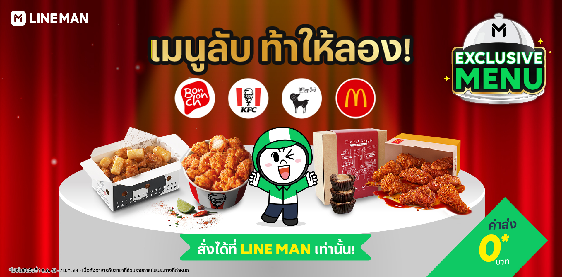LINE MAN ฉลองส่งท้ายปีเก่า ต้อนรับปีใหม่ ส่งความสุขด้วย 4 เมนูลับสุดเอ็กซ์คลูซีฟที่รับรองว่าไม่เคยมีที่ไหนมาก่อนจาก 4 ร้านอาหารแบรนด์ดัง ได้แก่ Bonchon, KFC, After You และ McDonald’s ที่มาสร้างสรรค์ตำรับอาหารสูตรลับเฉพาะสำหรับชาว LINE MAN เท่านั้น เมนูลับที่ต้องลอง กดสั่งกันได้แล้วตั้งแต่วันนี้ – 7 มกราคม 2564 บนแอปฯ LINE MAN คลิก https://lineman.onelink.me/1N3T/a52f60b