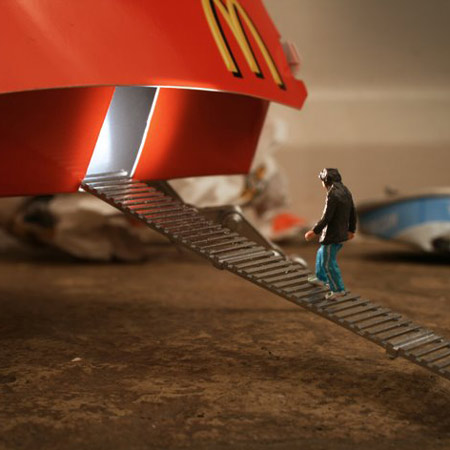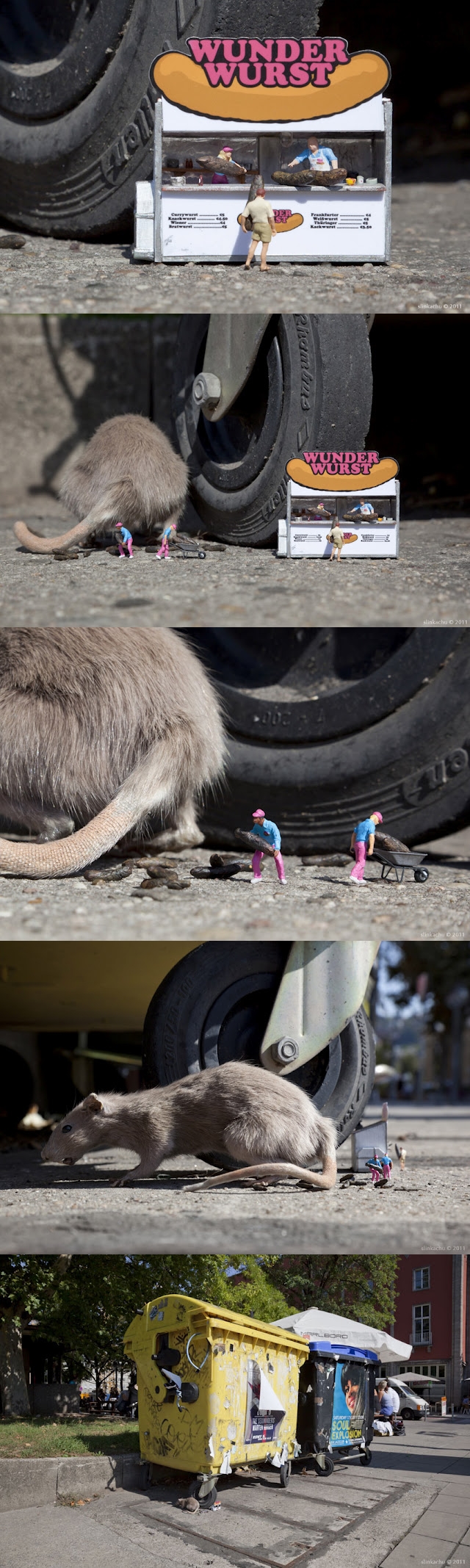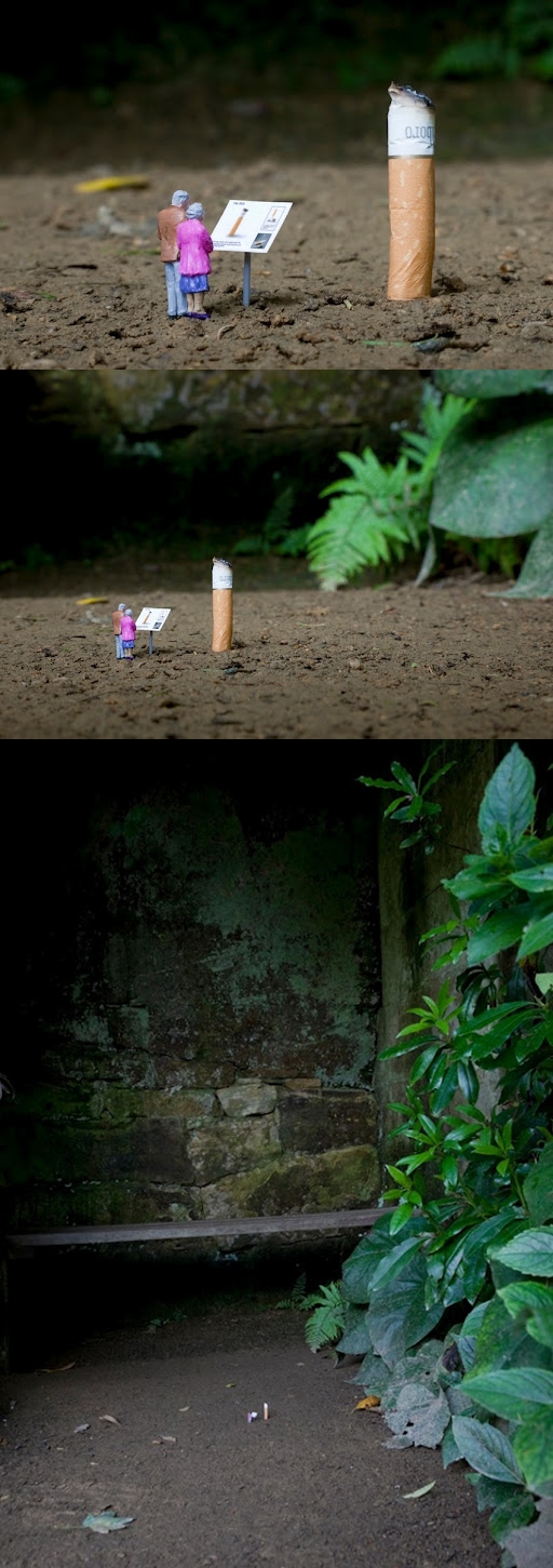กว่า 6 ปีที่ Slinkachu ศิลปินชาวอังกฤษสร้างสรรค์โลกใบจิ๋วในเมืองใหญ่ ด้วยงานเพ้นท์คนตัวเล็กๆ มากมายกับกิจกรรมที่ทำต่างสถานการณ์กันไปตามถนนหนทางต่างๆ ในกรุงลอนดอนและที่ต่างๆทั่วโลก เขาสามารถทำให้สิ่งที่ไม่น่าภิรมย์ ให้กลายเป็นสิ่งที่ใครๆก็ต้องหันและจ้องมองมันด้วยรอยยิ้มเล็กๆได้ ในอารมณ์แบบตลกร้าย เขาบอกว่าเขาทำมันเพราะอยากให้คนตระหนักถึงสิ่งแวดล้อมที่เกิดขึ้น และยังสะท้อนถึงความเหงา ความหม่นหมองของคนเมืองที่เป็นอยู่ทุกวันนี้ จากโลกเล็กๆเหล่านี้ ©