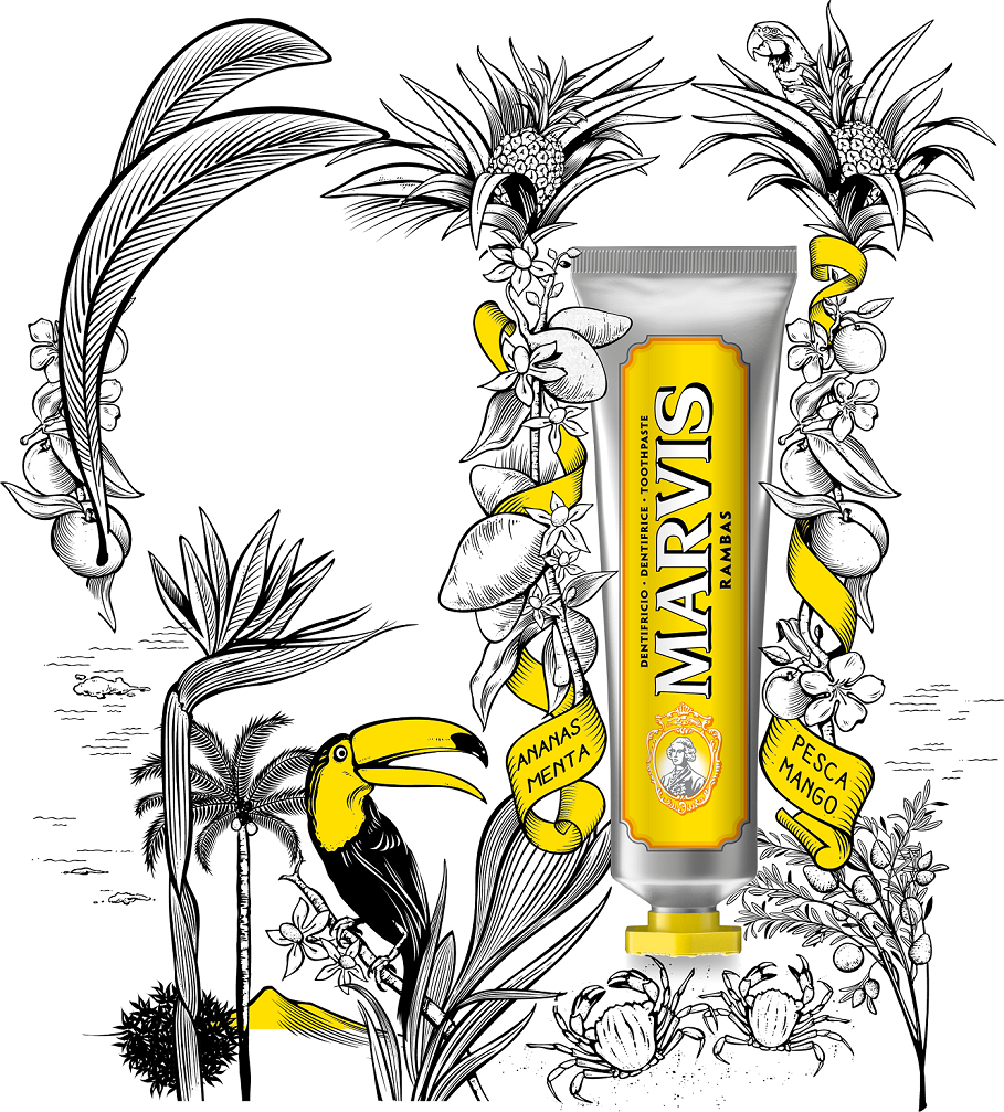 แรมบัส (Rambas): กลิ่นอันน่าหลงใหลที่เต็มไปด้วยมนต์เสน่ห์ของการเดินทางเพื่อค้นหาโลกและวัฒนธรรมใหม่ๆ ณ สถานที่เขียวชอุ่มในทวีปเขตร้อนชื้น อย่าง คิวบา ชิลี จาไมก้า ริโก้ บาฮามาส และโดมินิก้าที่เต็มไปด้วยบรรยากาศแห่งความร่าเริงและมีชีวิตชีวา ผ่านสีสันสดใส จังหวะดนตรี การเต้นรำ และเสียงหัวเราะของผู้คนที่รวมกันไว้อย่างลงตัว ด้วยรสชาติผลไม้แสนนุ่มละมุนลิ้น จากผลพีชสุกงอม (Ripe peach) สับปะรดหวาน (Sweet pineapple) และรสหวานอมเปรี้ยวจากมะม่วงอินเดีย (Alponso Mango) พร้อมยกระดับกลิ่นหอมและความรูสึกสดชื่นจากมินต์ (Mint) เอกลักษณ์เฉพาะยาสีฟันมาร์วิส ที่จะทำให้คุณรู้สึกช่วงเวลาของการเดินทางที่เต็มไปด้วยรอยยิ้ม ความสุข และเสียงหัวเราะอย่างแท้จริง