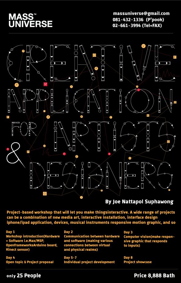 ระยะเวลาของ workshop 8 สัปดาห์ใน workshop นี้จะได้ผลิตโปรเจคต่างๆที่ทำให้ทุกสิ่งนั้นกลายเป็น interactive ภายใน 8 สัปดาห์นี้ทุกคนจะได้ผลิตโปรเจคหลากหลายแนว เช่น ศิลปะสื่อใหม่, interactive installation, การออกแบบ interface, application ของ iPhone/iPad, อุปกรณ์ต่างๆ, เครื่องดนตรี, responsive motion graphic, และอื่นๆอีกมากมาย