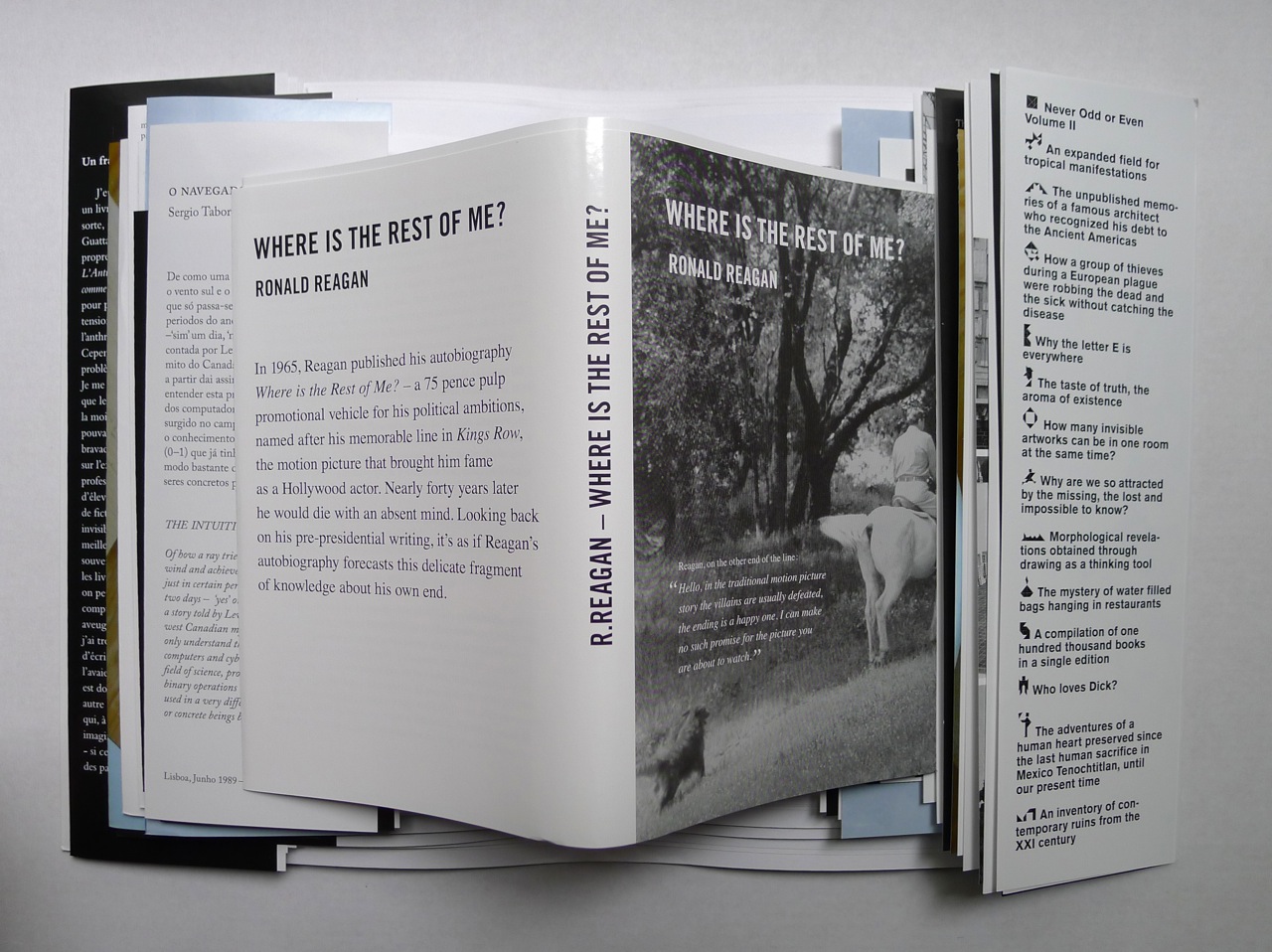 มาร่วมเดินทางไปกับ Never Odd Or Even, volume II. หนังสือรวมบทประพันธ์หลายๆ เรื่องไม่ว่าจะเป็น unpublished memories, tropical manifestations, intragenealogy, Why the letter E is everywhere?… และอีกมากมาย ความแปลกคือหนังสือเล่มนี้มีแต่ปกล้วนๆซ้อนกันอยู่กว่า 30 เล่มรวมกันอยู่ในหนังสือเล่มเดียว และเป็นหนังสือ Rere book ที่หายากมาก เราสามารถหาซื้อความแปลกนี้ได้ที่ http://quedesignstore.com (Art and Design store ร้านสัญชาติไทยเราเอง)