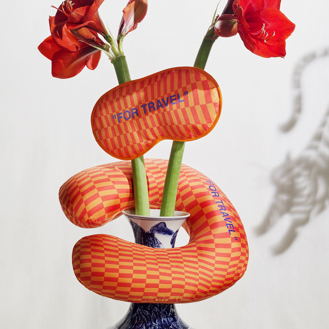 การเดินทางในแบบฉบับของออฟไวท์ (Off-WhiteTM) ย่อมต้องพิเศษไม่เหมือนใครกับชุดอุปกรณ์การเดินทางที่ดูน่าสะสมและหาไว้มาครอบครอง หมอนรูปตัวยูและผ้าปิดตาลายตาราง สีส้มแดงห่อด้วยผ้าไหมอย่างดี พร้อมข้อความง่ายๆ แต่เป็นเอกลักษณ์ “FOR TRAVEL”