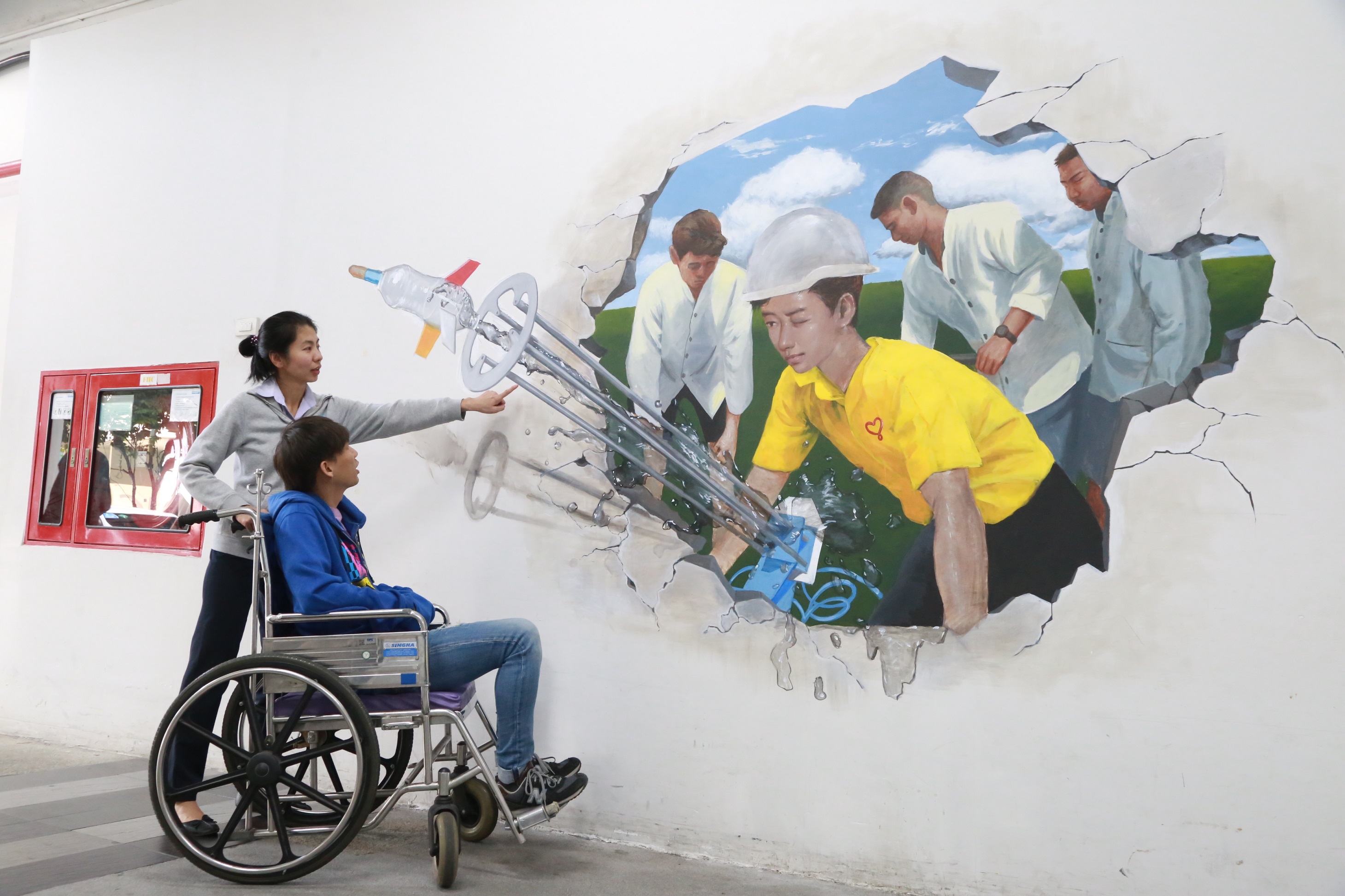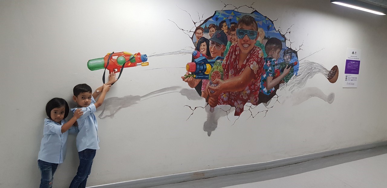 “จรวดน้ำสร้างสุข” – อีกหนึ่งภาพที่อยู่ด้านนอกอาคาร 1 มีแรงบันดาลใจมาจาก คุณอัน–ธนาเดช เขียวแก้ว คุณครูวิทยาศาสตร์ที่เคยเป็นอดีตผู้ป่วยโลหิตจางธาลัสซีเมีย “เพราะวัยเด็กเราไม่ได้ทำอะไรแบบนี้ เราจึงขอเป็นคนให้ช่วงเวลาแบบนี้แก่คนอื่น” คุณอัน–ธนาเดช เล่าถึงที่มาของภาพนี้ว่ากว่า 15 ปี ที่ต้องทรมานจากอาการของโรคโลหิตจางธาลัสซีเมีย เขาไม่สามารถมีชีวิตวัยเด็กอย่างเด็กทั่วไป “ตอนเด็กๆ ผมทำกิจกรรมกลางแจ้งแบบหักโหมไม่ได้เลย แค่วิ่งเล่นเรายังวิ่งได้ไม่เหมือนเพื่อนเลย บางครั้งได้แต่มองเพื่อนเล่นบาสเก็ตบอลอยู่ข้างสนาม จนเมื่อผมอายุได้ 17 ปี ได้เข้ารับการรักษา ณ โรงพยาบาลรามาธิบดี ผมจึงสามารถใช้ชีวิตได้อย่างคนทั่วไป แม้ว่าขั้นตอนการรักษาจะทรมานและทำให้ต้องหยุดเรียนไป 1 ปีเต็ม สุดท้ายผมก็ผ่านมันมาได้ ขอให้มีกำลังใจ เชื่อเสมอว่าต้องหาย ผมบอกกับตัวเองเสมอว่า ก็แค่ตาย ถ้าเราไม่สู้ก็แพ้” จากการที่เคยเป็น “ผู้รับ” ในวันวาน มาวันนี้คุณอันเลือกที่จะเป็น “ผู้ให้” ด้วยการเลือกเดินทางสายอาชีพครูวิทยาศาสตร์สอนเด็กนักเรียนอยู่ที่จังหวัดขอนแก่น