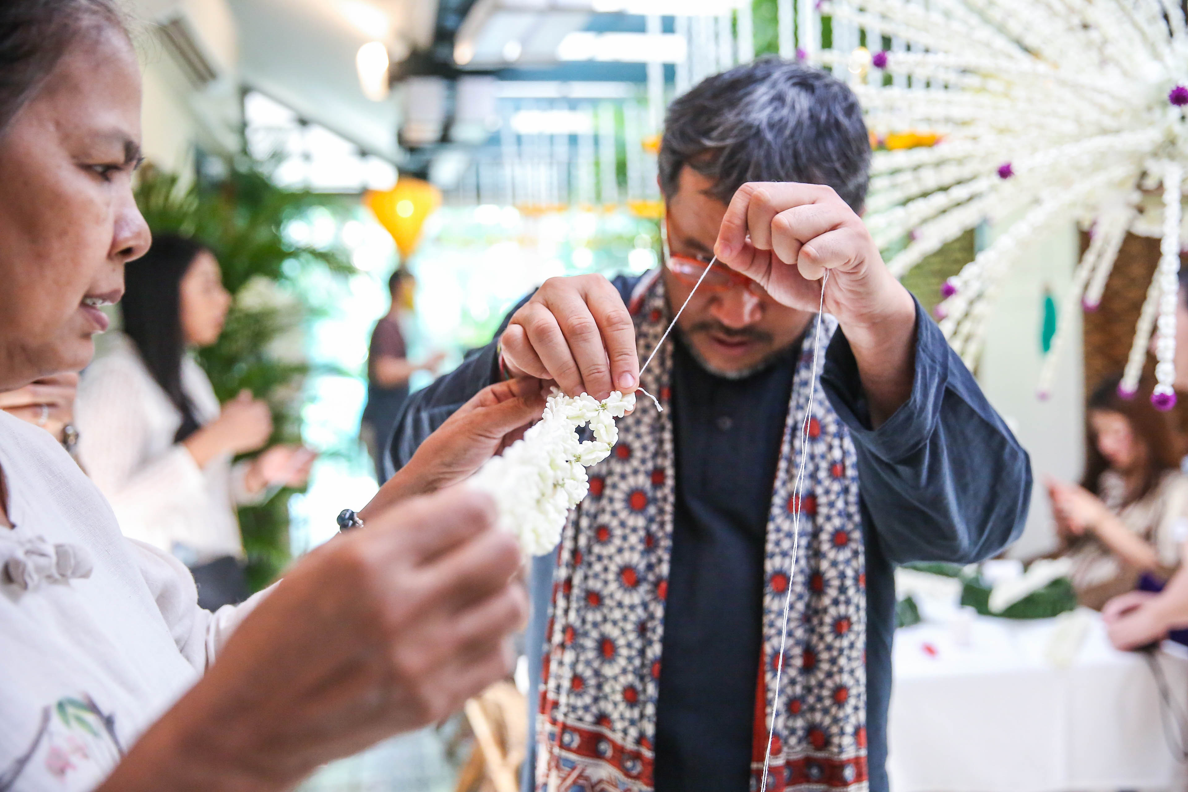 ส่วนนักออกแบบและจัดดอกไม้ชื่อดัง สกุล อินทกุล เล่าถึงที่มาของตาข่ายหน้าช้าง ซึ่งเป็นเครื่องแขวนดอกไม้สดที่ทำขึ้น เพื่อใช้ในการประดับตกแต่งอาคาร สถานที่ และสิ่งเคารพบูชา รวมทั้งใช้คลุมหน้าผากช้างสำคัญเวลาเข้าพิธี เช่น พิธีถวายช้างสำคัญ หรือสมโภชช้าง เป็นต้น “งานเครื่องดอกไม้ เป็นงานหัตถศิลป์ของไทยที่มีความละเอียดอ่อน ต้องใช้ความอดทนสูงในการทำ สำหรับเครื่องแขวนดอกไม้สดในรูปแบบตาข่ายหน้าช้างนั้น รังสรรค์ขึ้นจากการนำดอกไม้เล็กๆ เช่น ดอกรัก ดอกบานไม่รู้โรย ดอกจำปา นำมาเรียงร้อยรวมกันด้วยเส้นด้าย โดยสามารถนำตาข่ายหน้าช้างดอกไม้สดใช้แขวนตามสถานที่ต่าง ๆ เช่น ประตู หน้าต่าง ฯลฯ เพื่อใช้ประดับตกแต่งสถานที่ให้ดูสวยงาม ต้อนรับเทศกาลปีใหม่ไทยที่กำลังจะถึงนี้ รวมทั้งยังเป็นการเรียนรู้งานศิลป์อีกแขนงหนึ่งของไทยที่คนรุ่นใหม่ควรช่วยกันสืบสานภูมิปัญญาทรงคุณค่านี้ไว้ให้คงอยู่สืบไป”