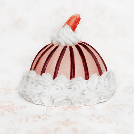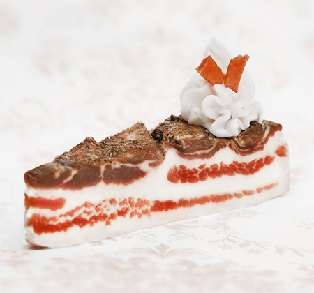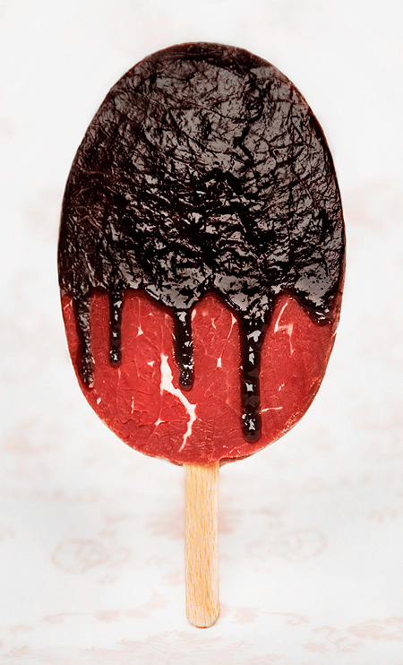Austrian artist and photographer Jasmin Schuller proves you don’t unnecessarily need image processing software like Photoshop to put consumer perception to the test. For her Sweat Meat series of so-called desserts, all it took was outstanding craftsmanship and attention to detail. She used plenty of meat scraps, two liters of blood, a bucket of animals grease and five kilos of raw meat, and processed them all into mouth-watering treats.