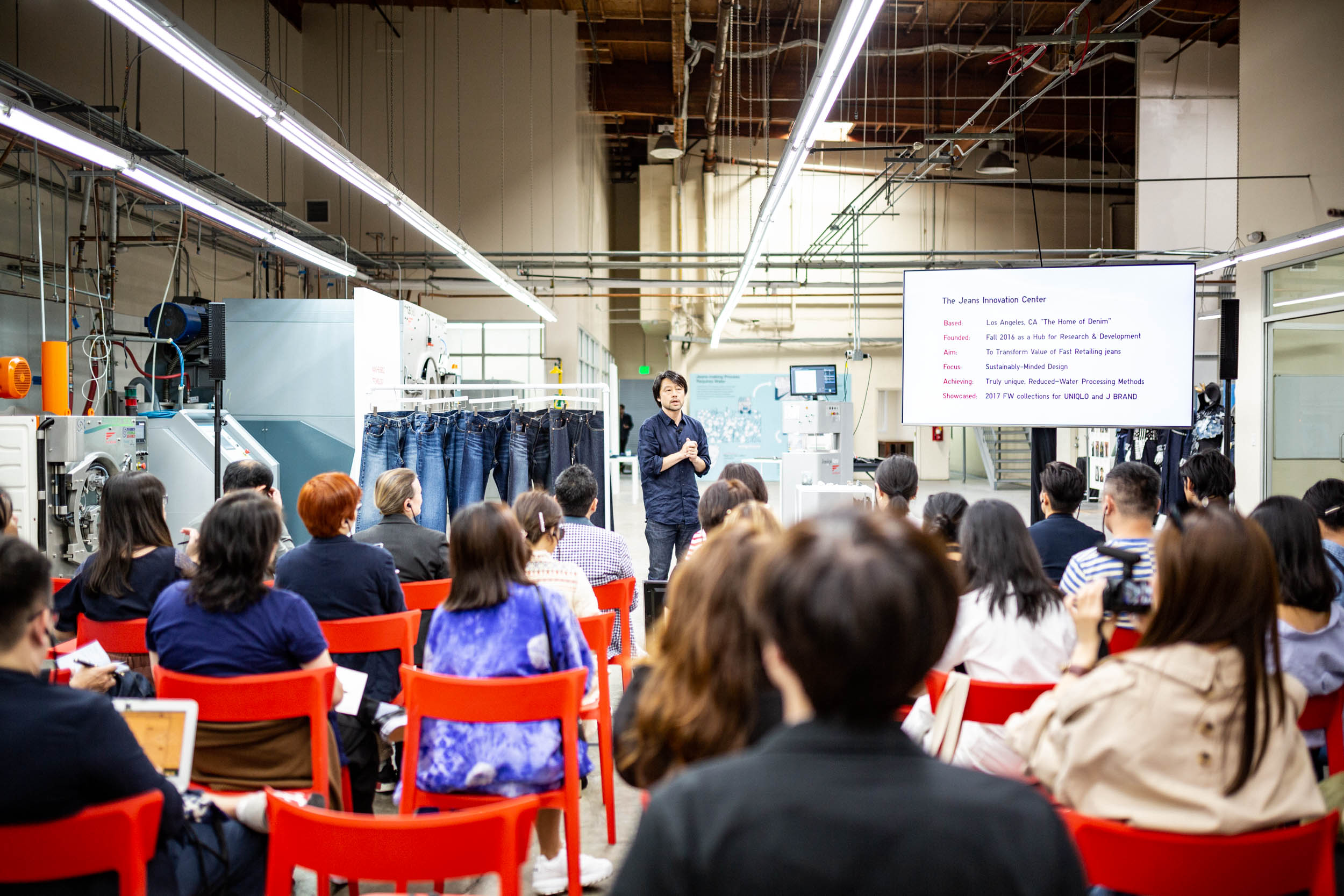 Fast Retailing เปิดให้สื่อมวลชนจากทั่วโลกเข้าเยี่ยมชมศูนย์นวัตกรรมยีนส์ในลอสแองเจลิส ซึ่งมีบทบาทเป็นศูนย์วิจัยและพัฒนายีนส์ของกลุ่มฯ โดยเป็นการเปิด เพื่อให้เข้าเยี่ยมชมศูนย์ และได้เห็นถึงกระบวนการฟอกแบบใหม่ที่ลดการใช้น้ำลงได้สูงสุดถึง 99%* และมีอัตราการลดลงโดยเฉลี่ยกว่า 90% พร้อมกับทำความเข้าใจว่ากระบวนการลดการใช้น้ำอันก้าวล้ำนี้มีบทบาทอยู่ในส่วนใดบนแนวทางด้านความยั่งยืนโดยภาพรวมของฟาสต์ รีเทลลิ่ง