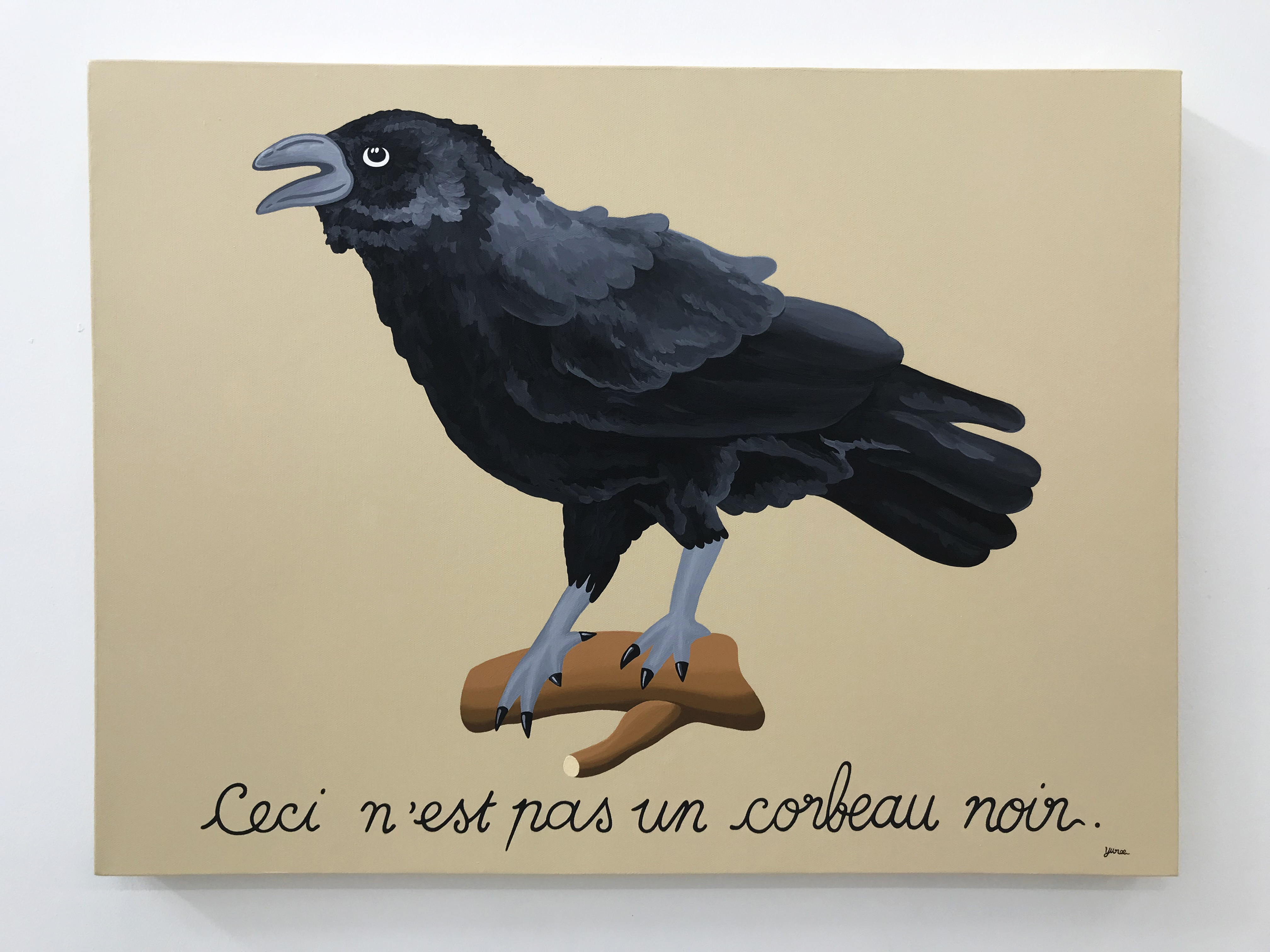 นอกจากนั้นยังมีภาพ “Ceci n’est pas un corbeau noir (นี่ไม่ใช่อีกาสีดํา)” ที่ได้แรงบันดาลจากภาพ Ceci n’est pas une pipe (นี่ไม่ใช่ไปป์ ) ของเรเน่ มากริต (René Magritte) ผสมผสานส่วนหนึ่งของคําทํานาย ที่ว่าด้วยความเห็นผิดเป็นชอบเรื่องอีกาขาว (เปรียบเช่นคำที่พูดว่าเห็นกงจักรเป็นดอกบัว) ภาพนี้สะท้อนถึงความสัมพันธ์ระหว่างคําพูดกับสิ่งของ สิ่งที่สังคมรับรู้ และยอมรับอย่างไม่ตั้งคําถามใดๆ ทั้งสิ้น สิ่งเหล่านี้ถูกถ่ายทอดจากรุ่นสู่รุ่น
