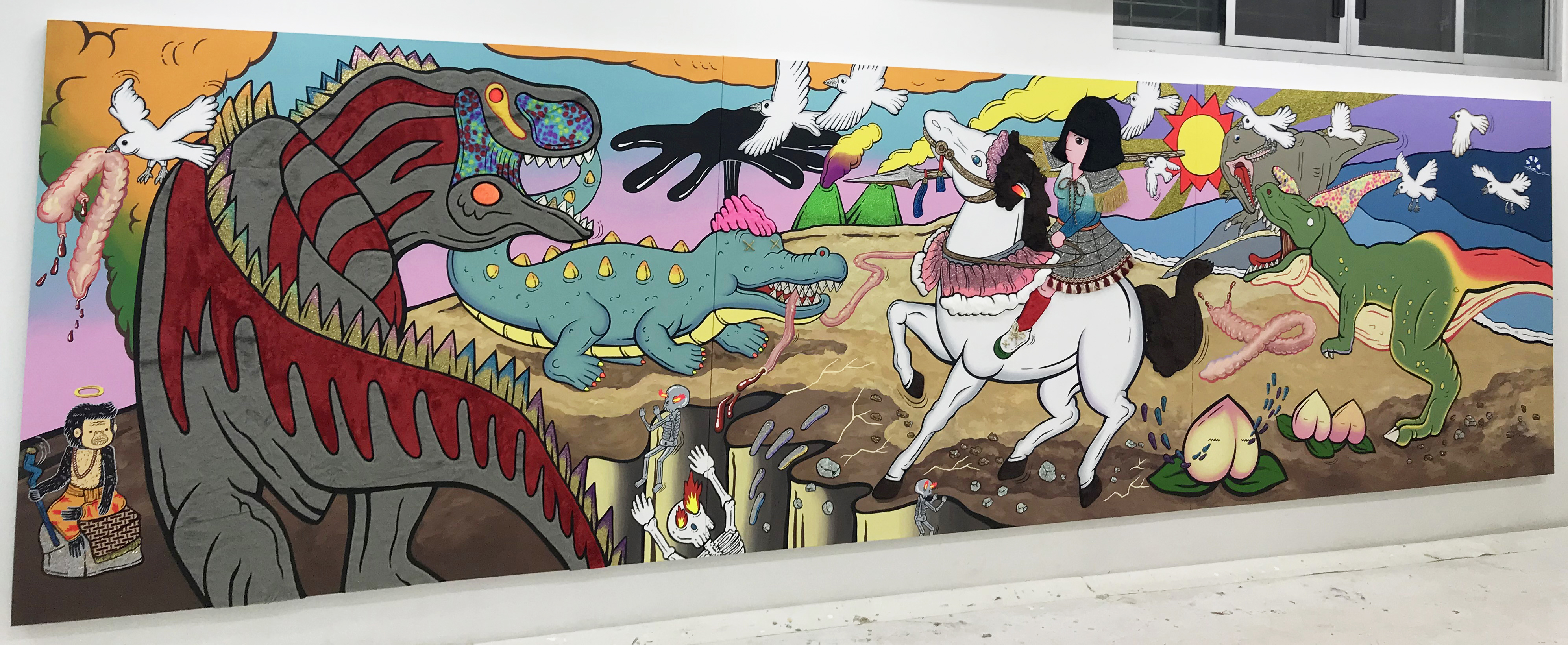 ภาพสีสันสดใสสไตล์มังงะบนผืนผ้าใบแฝงเหตุการณ์ทางสังคมที่น่าอึดอัดและเรื่องราวความเจ็บปวดและความสญูเสียส่วนตัวของศิลปิน ผลงานชุดใหม่นี้ได้สะท้อนว่านิทานพื้นบ้านและตํานานต่างๆ มีผลต่อชีวิตประจําวันและวัฒนธรรมทางสังคมของเราอย่างไร ซึ่งในหลายๆ ครั้ง สามารถนําเราไปในทางที่บิดเบือนและลวงตาจากภาพความจริง