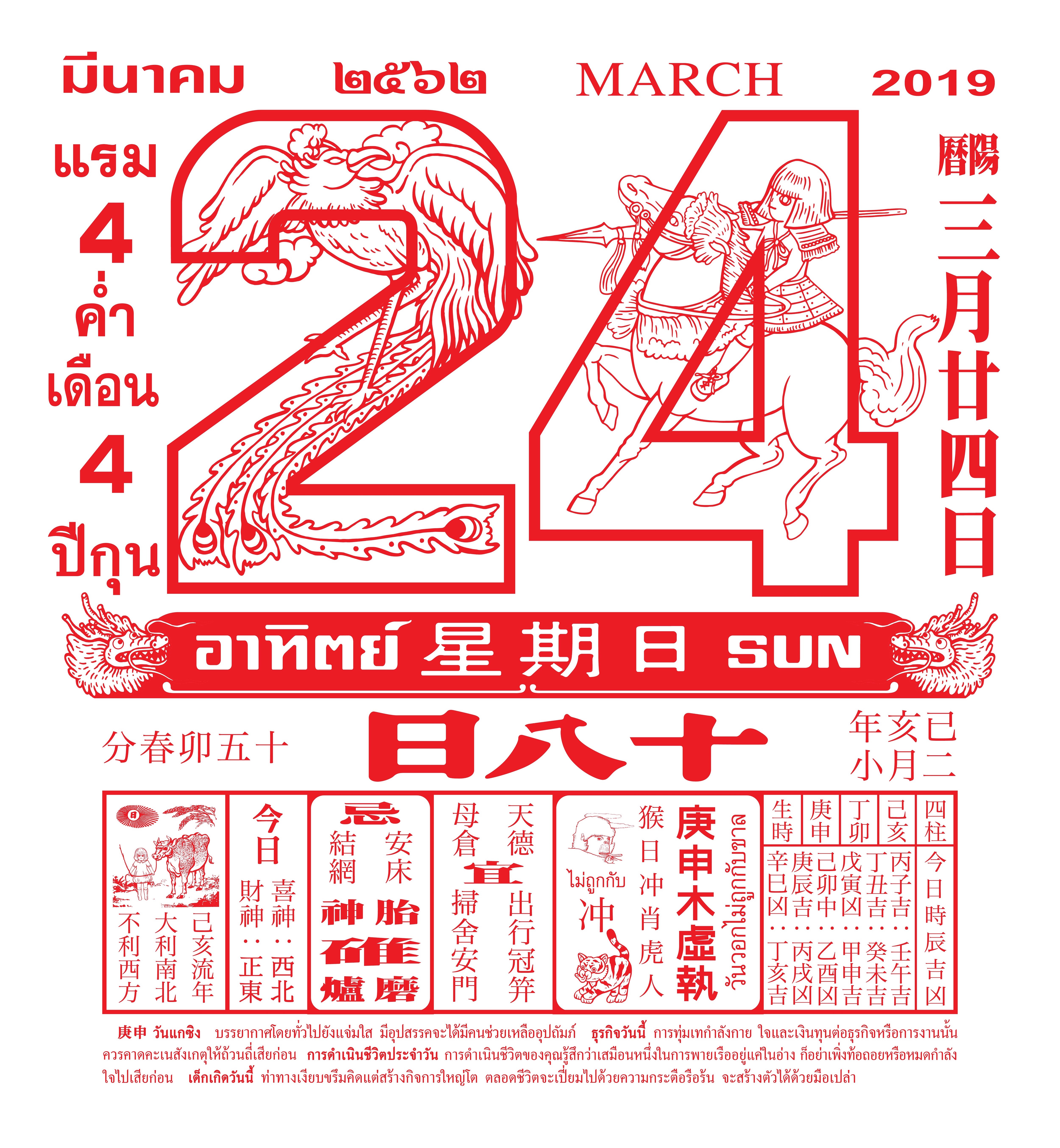 “The Prophecy of 24 March 2019 (คําทํานายของวันที่ 24 มีนาคม 2562)” เป็นภาพพิมพ์ซิลค์สกรีนที่มีรูปแบบมาจากปฎิทินจีน ด้านล่างมีคําทํานายเขียนถึงวันที่ตรงกับวันเลือกตั้งของไทยครั้งแรกนับตั้งแต่ ปี พ.ศ. 2554 เป็นต้นมา ซึ่งเป็นช่วงเวลาที่พวกเราต้องการความหวัง พร้อมกับความเป็นไปได้ใหม่ๆ ในประเทศไทย