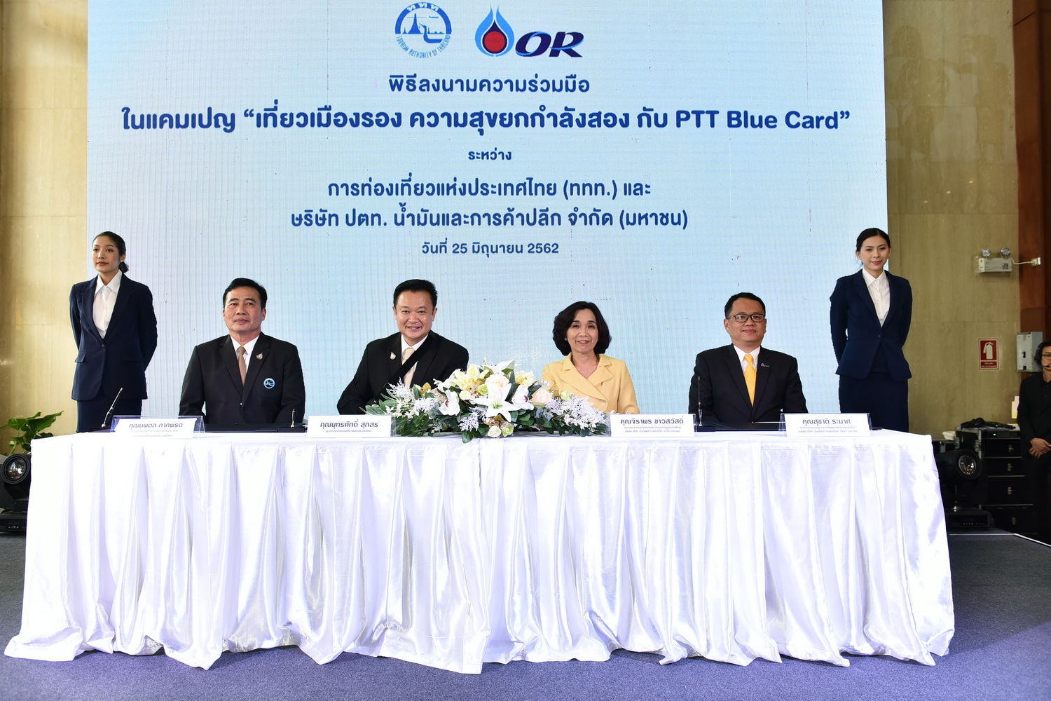 เมื่อผู้คนเริ่มถวิลหาประสบการณ์ใหม่ๆ ในการเดินทางท่องเที่ยว จังหวัดเมืองรองจึงถือเป็นทางเลือกใหม่ ที่จะเพิ่มความสุขที่ยิ่งใหญ่ของนักเดินทาง ดังนั้น การท่องเที่ยวแห่งประเทศไทย (ททท.) ได้ผนึกกำลังกับ บริษัท ปตท. น้ำมันและการค้าปลีก จำกัด (มหาชน) หรือ พีทีที โออาร์ จัดพิธีลงนามบันทึกข้อตกลงความร่วมมือ พร้อมแถลงข่าวเปิดแคมเปญ “เที่ยวเมืองรอง ความสุขยกกำลัง 2 กับ พีทีที บลูการ์ด” ชวนคนไทยออกเดินทางไปสัมผัสความงามทางธรรมชาติ วัฒนธรรม วิถีชุมชน และภูมิปัญญาท้องถิ่นอันน่าประทับใจในพื้นที่เมืองรอง โดยสมาชิกบัตรสะสมคะแนน พีทีที บลูการ์ด (PTT Blue Card) สามารถนำคะแนนสะสมมาแลกเป็นส่วนลดเพื่อใช้แทนเงินสด สำหรับการใช้บริการที่พัก เติมน้ำมัน ช็อป ชิม ชิล กันแบบเต็มอิ่ม พร้อมกันนี้ยังเปิดตัวพรีเซ็นเตอร์สาวสวย แพทตี้ – อังศุมาลิน สิรภัทรศักดิ์เมธา ที่จะมาชวนทุกคนให้ออกเดินทางท่องเที่ยวเมืองรองเพื่อเปิดมุมมองใหม่ในแบบที่ใช่ตามสไตล์ที่ชอบอีกด้วย