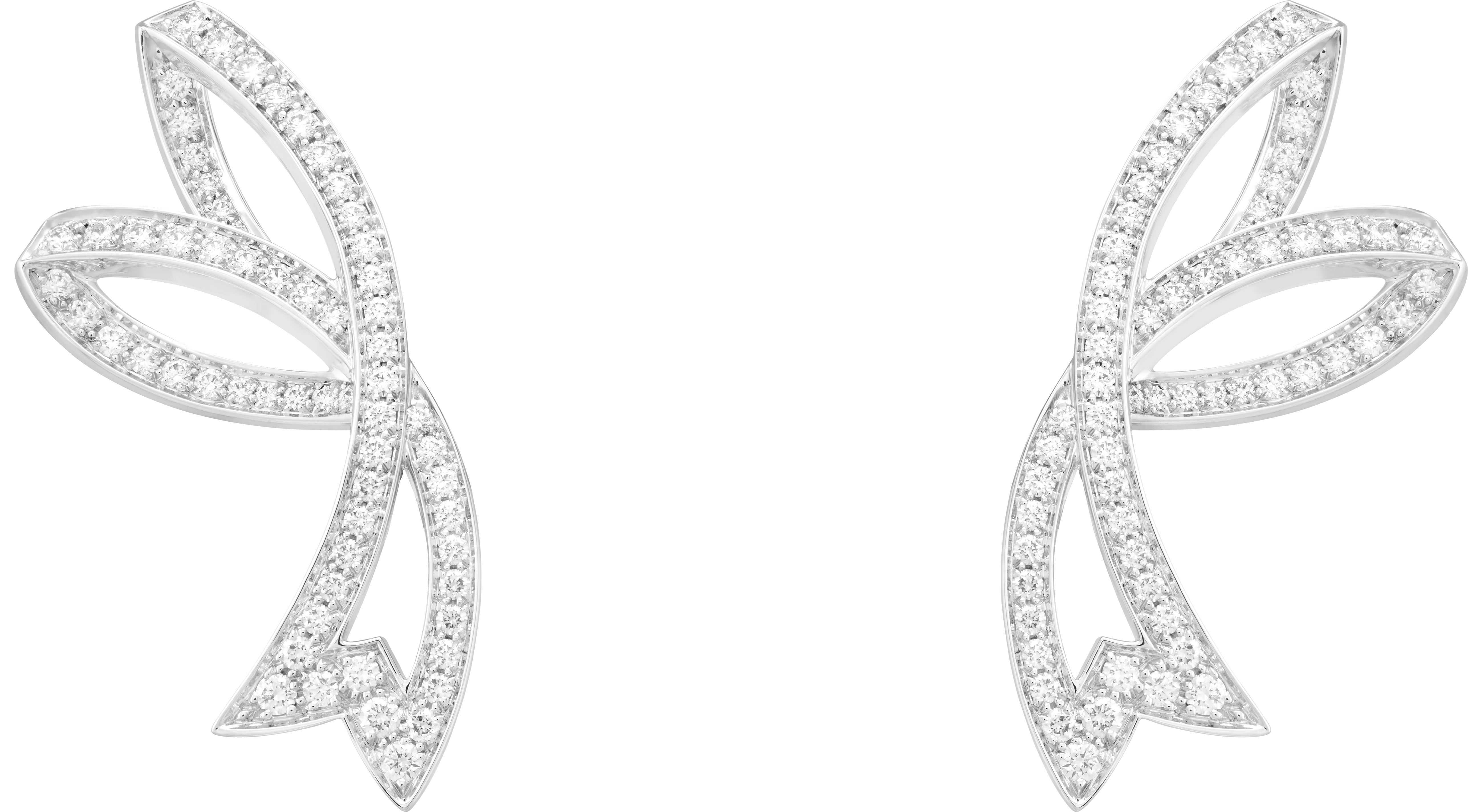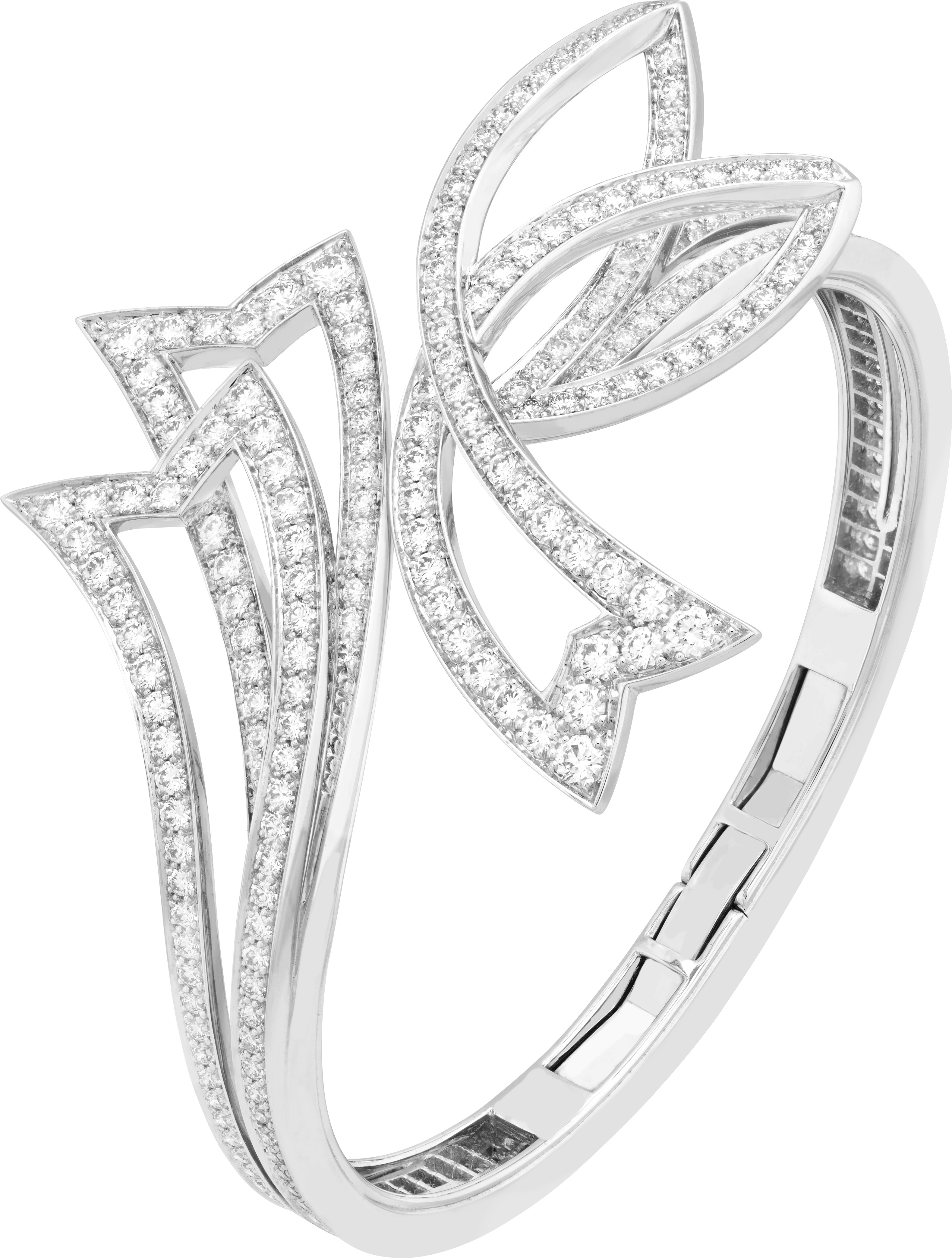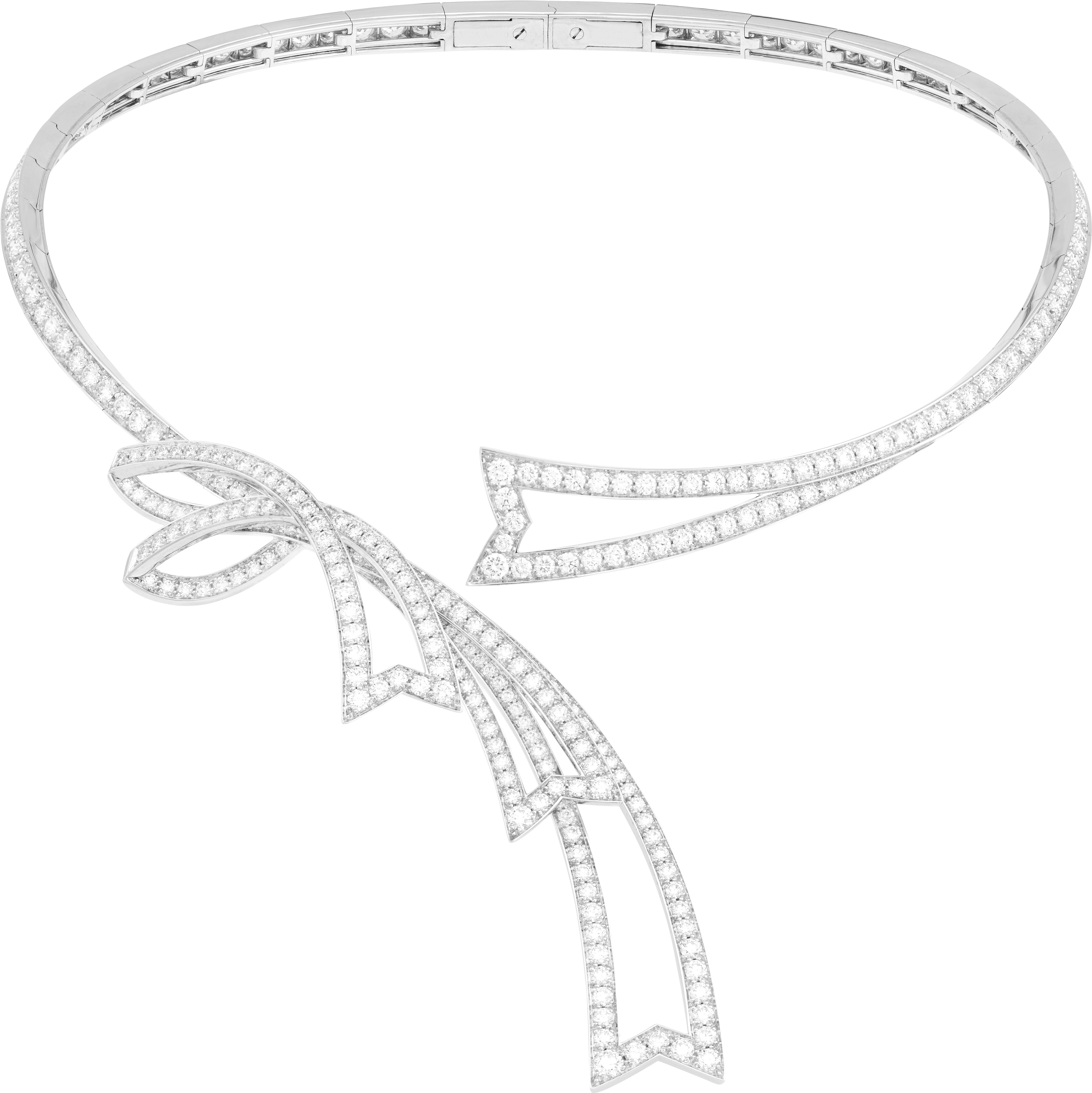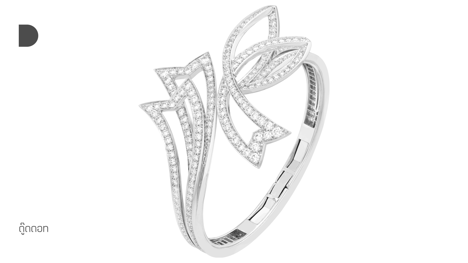 บทบรรจบทางความกลมกลืนของโทนสีระหว่างทองคำขาวกับน้ำเพชรใสสกาว กลายเป็นลีลาล้อแสงสะกดสายตา ตัวเรือนทองรองรับอัญมณีคุณภาพสูงสุดจากการคัดสรรตามมาตรฐานเคร่งครัดอย่างที่สุด นั่นคือ D, E และ F ในแง่ของสีสัน และ IF ถึง VVS2 ในแง่ของความกระจ่างใส ประกายไฟในน้ำเพชรเลอค่าจรัสจ้าจากการใช้ตัวเรือนฉลุโปร่งอำนวยให้แสงส่องผ่านเพื่อทวีความเข้มแสงจากมิติภายใน