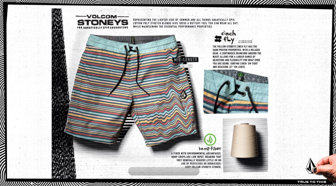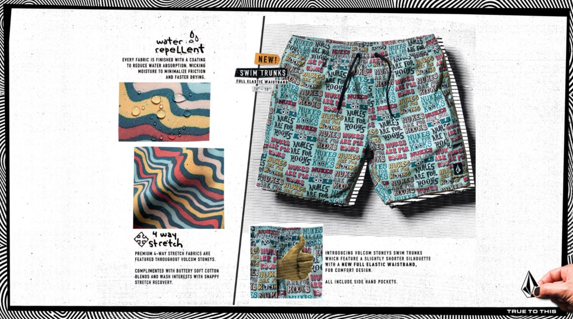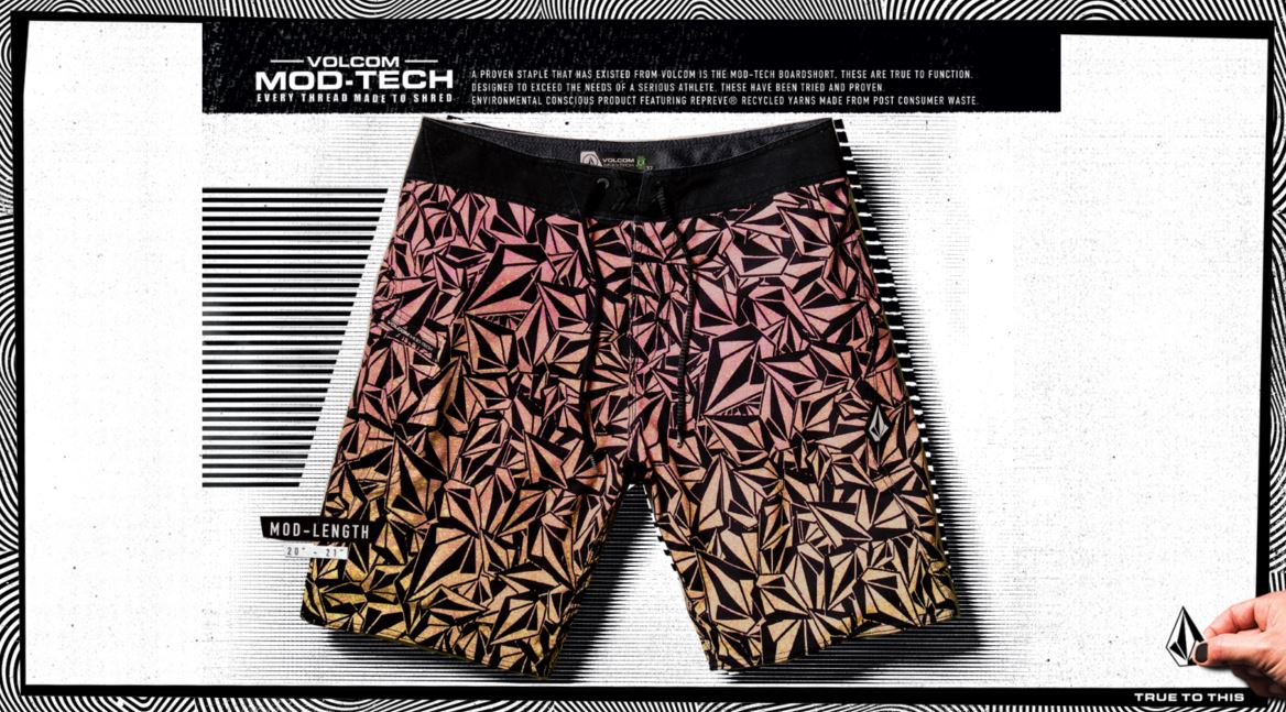 ในครั้งนี้ทางแบรนด์จะเปิดตัว ผลิตภัณฑ์กางเกง Board short รุ่นใหม่ สำหรับกางเกง Board short นั้นจะมีคุณสมบัติพิเศษที่แตกต่างจากกางเกงยี่ห้ออื่น Board short Volcom จะมีอยู่ด้วยกัน 3 รุ่นได้แก่ MOD-TECH (ม็อดเทค) , STONEY (สโตนนี่) , TRUNKS (ทรังค์) ซึ่งทั้ง 3 รุ่นนี้ออกแบบมาเพื่อให้ครอบคลุมทั้งการเล่น Surf หรือว่าเล่นน้ำ รวมทั้งการสวมใส่ในชีวิตประจำวันอีกด้วย